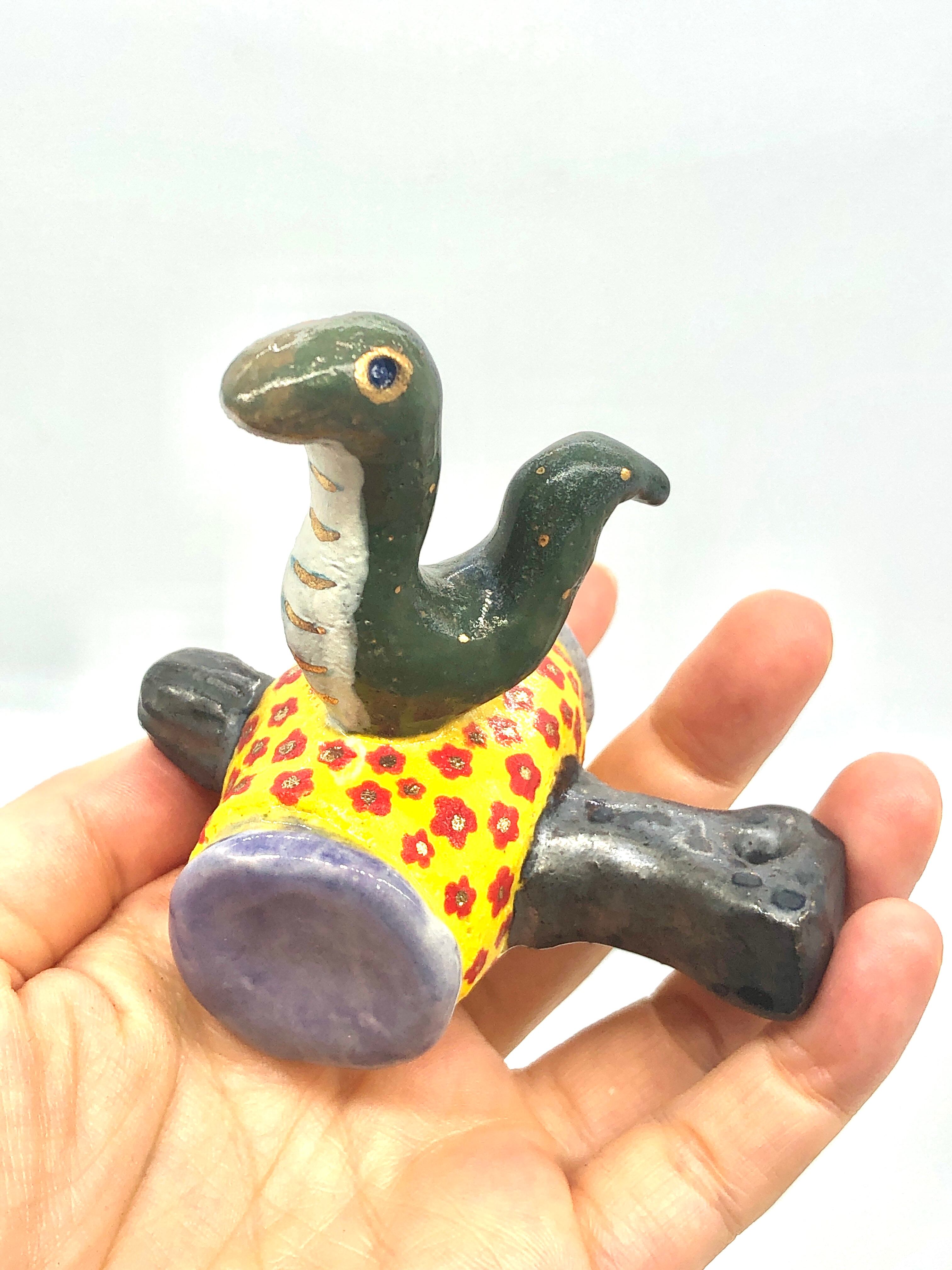 陶土をてびねりし、素焼き後に陶芸用下絵具や釉薬で絵付けをし1230度で焼成しています