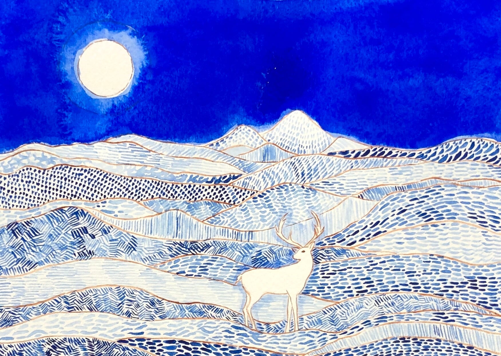 こちらは白い月と鹿の作品。 青い世界に白い月。 神鹿が月と響き合う。 静寂の中で全てが一つだった次元が現れる。 17 × 22 cm アクリル絵の具 額装後に発送いたします