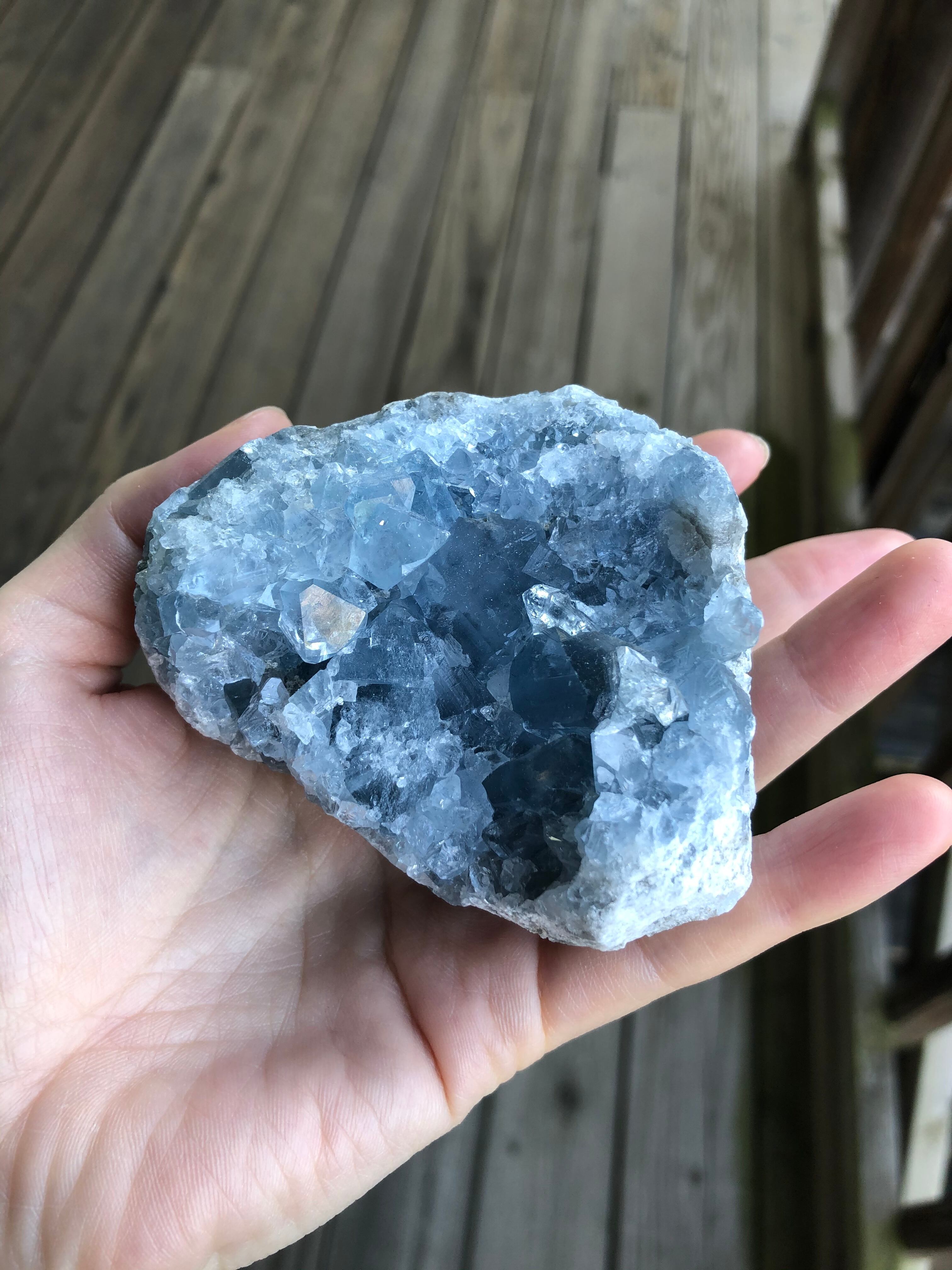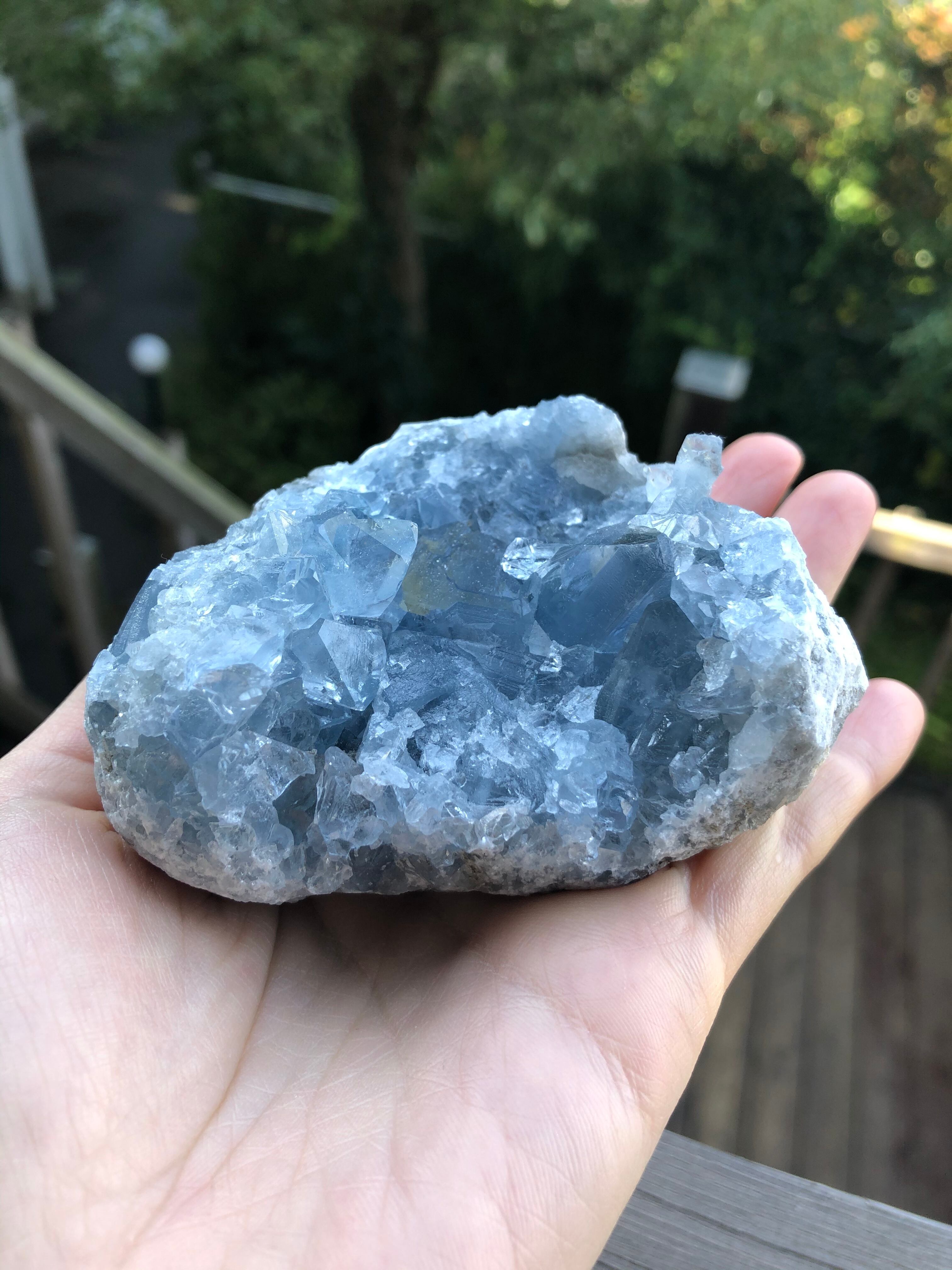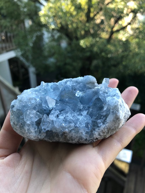 通常、セレスタイトは直射日光に当たると色褪せるのですが、なぜか色が濃くなったように見えます。