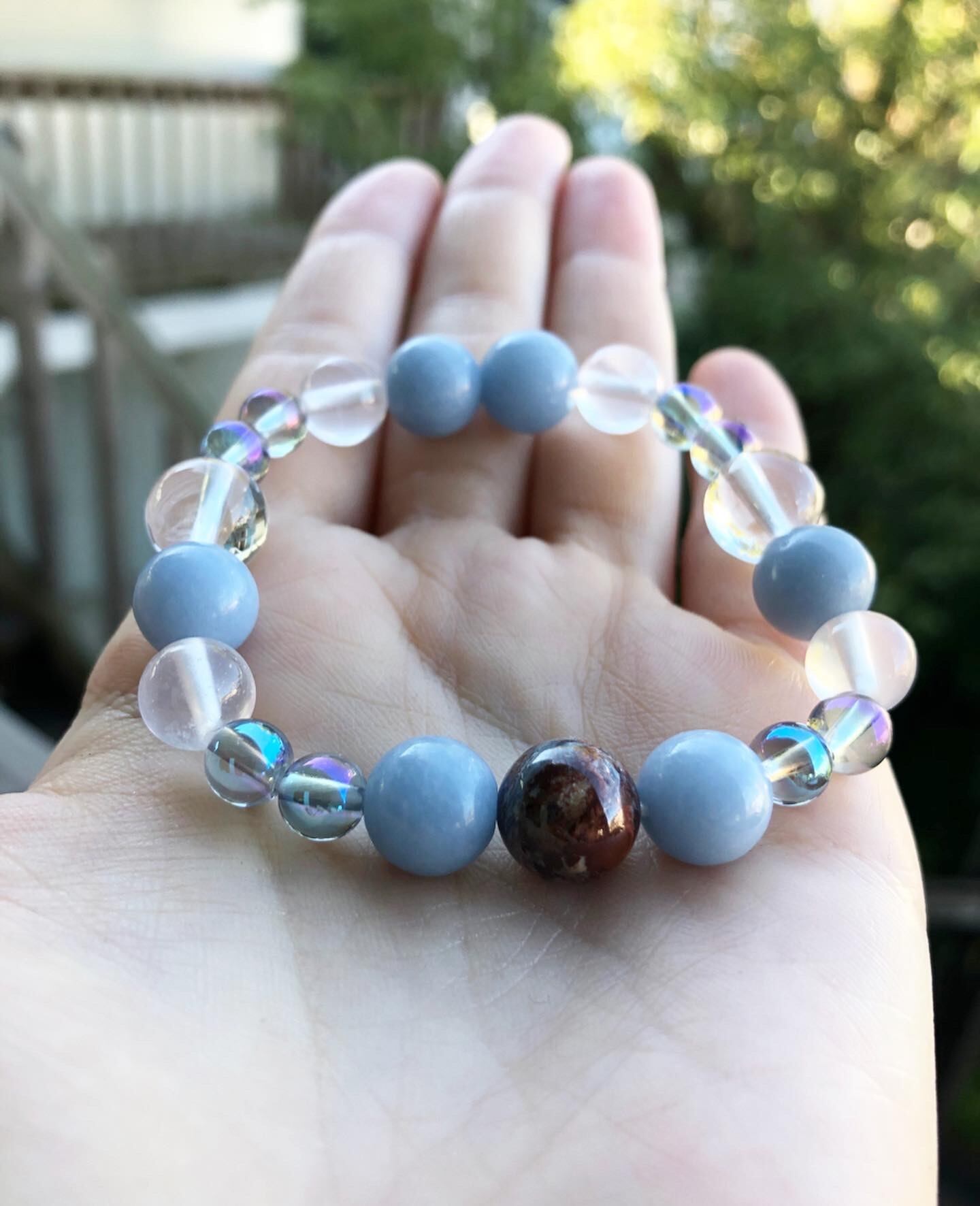 エンジェライト、スギライト、オーラクォーツ、ローズクォーツのブレスです。
