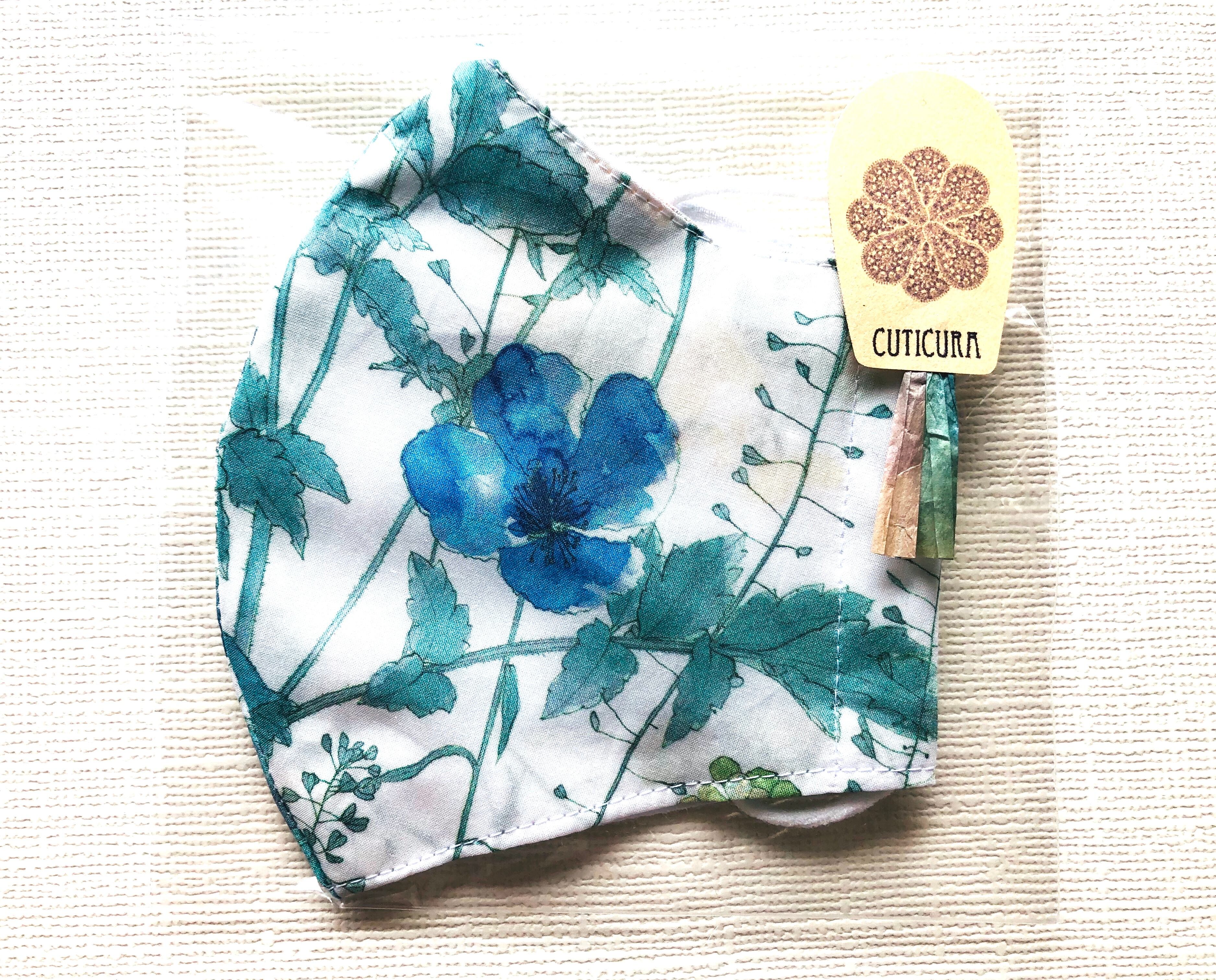 清浄なエネルギーで気分をスッキリさせてくれるような青い花のモチーフのコットンの布マスクです。