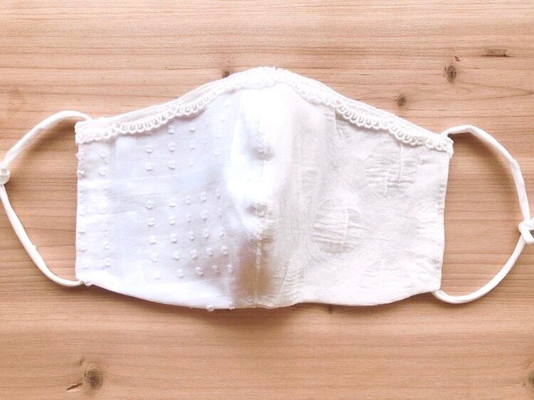 こちらのマスクは半分が白の水玉とストライプ、もう半分は生成りの水玉の布です。紐は柔らかい白の布ゴム。