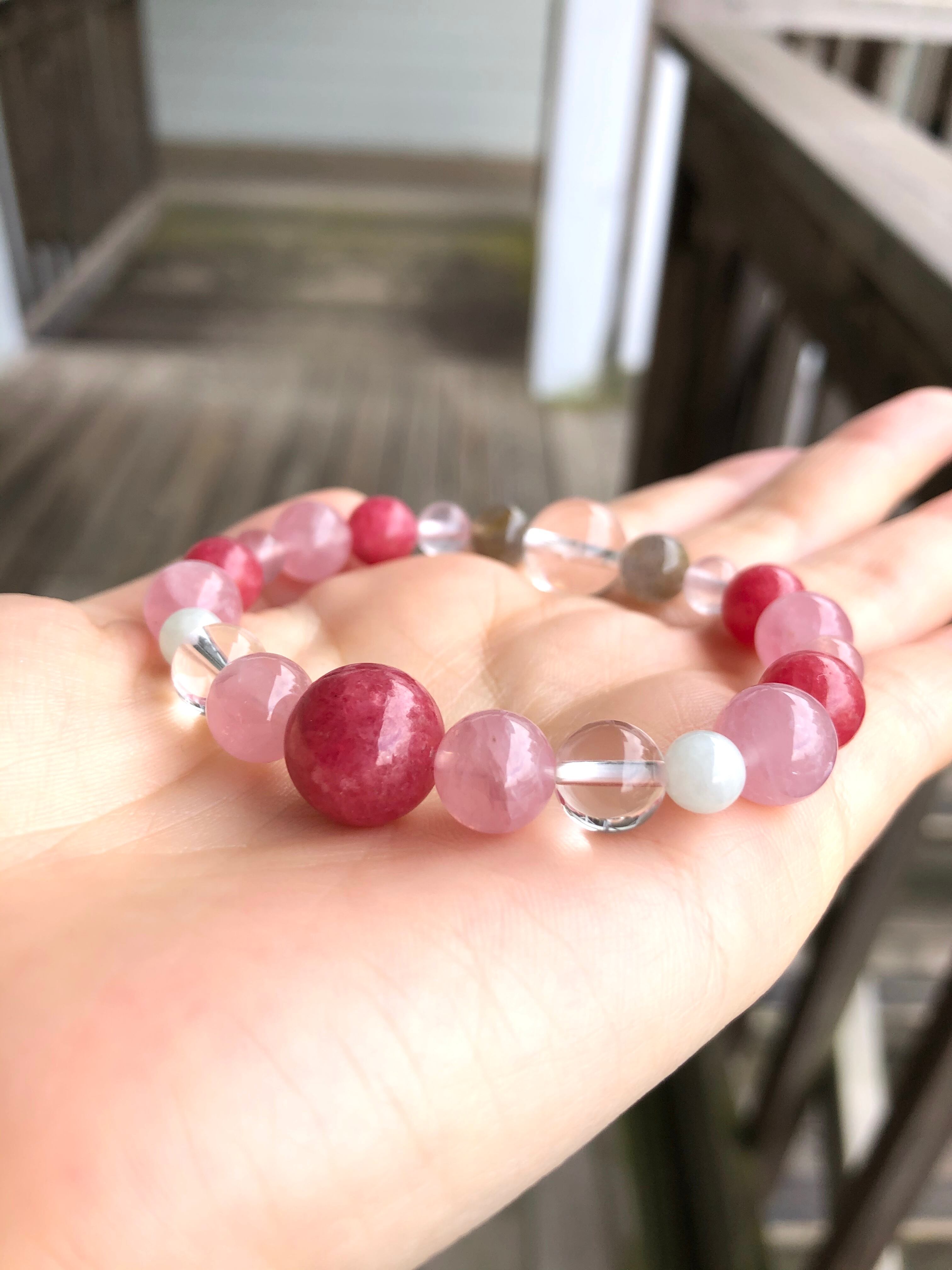 自己愛のためのブレス3部作の2つ目は、ローズクォーツ、ロードナイト、水晶、ラブラドライト、翡翠のブレス。