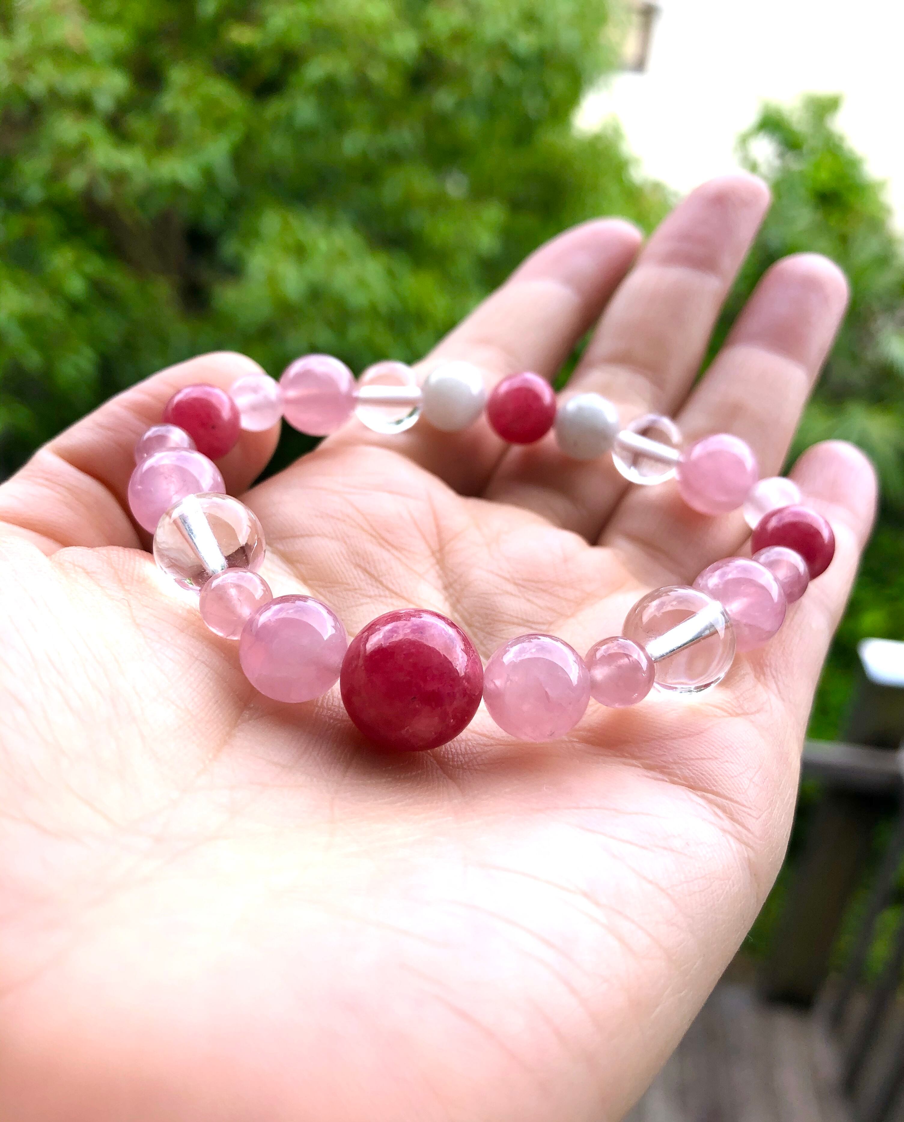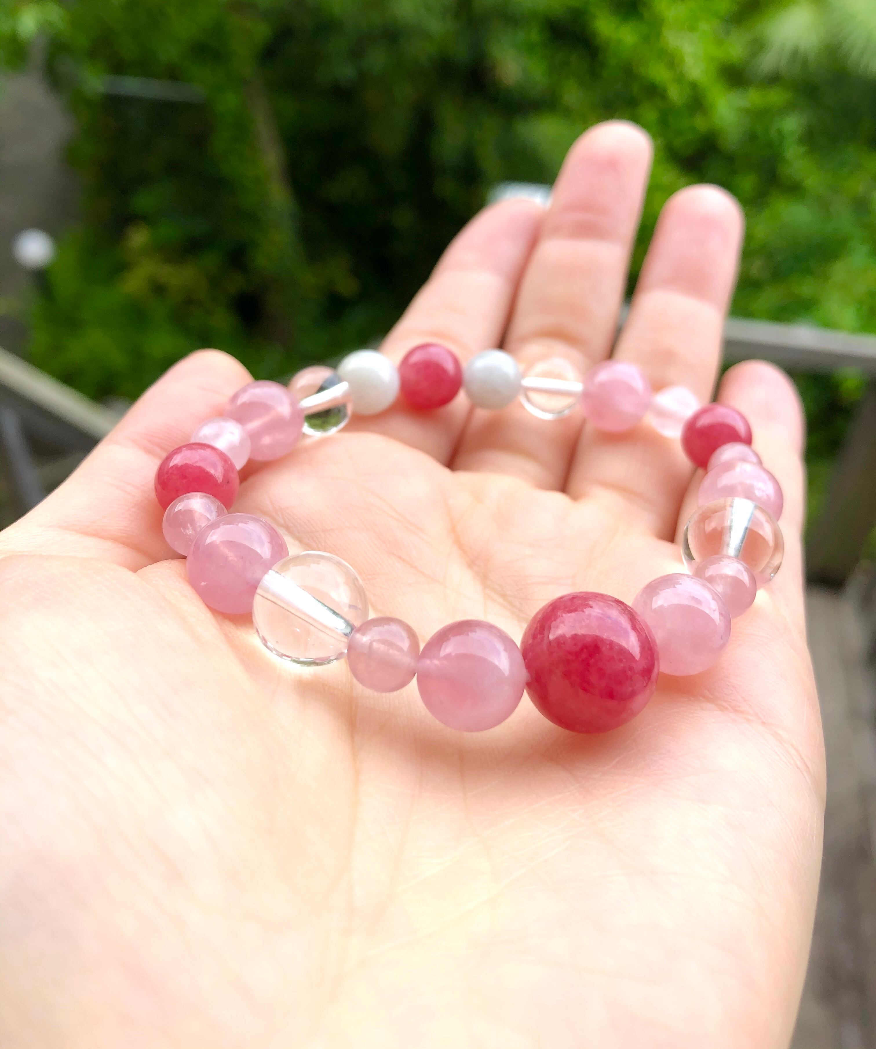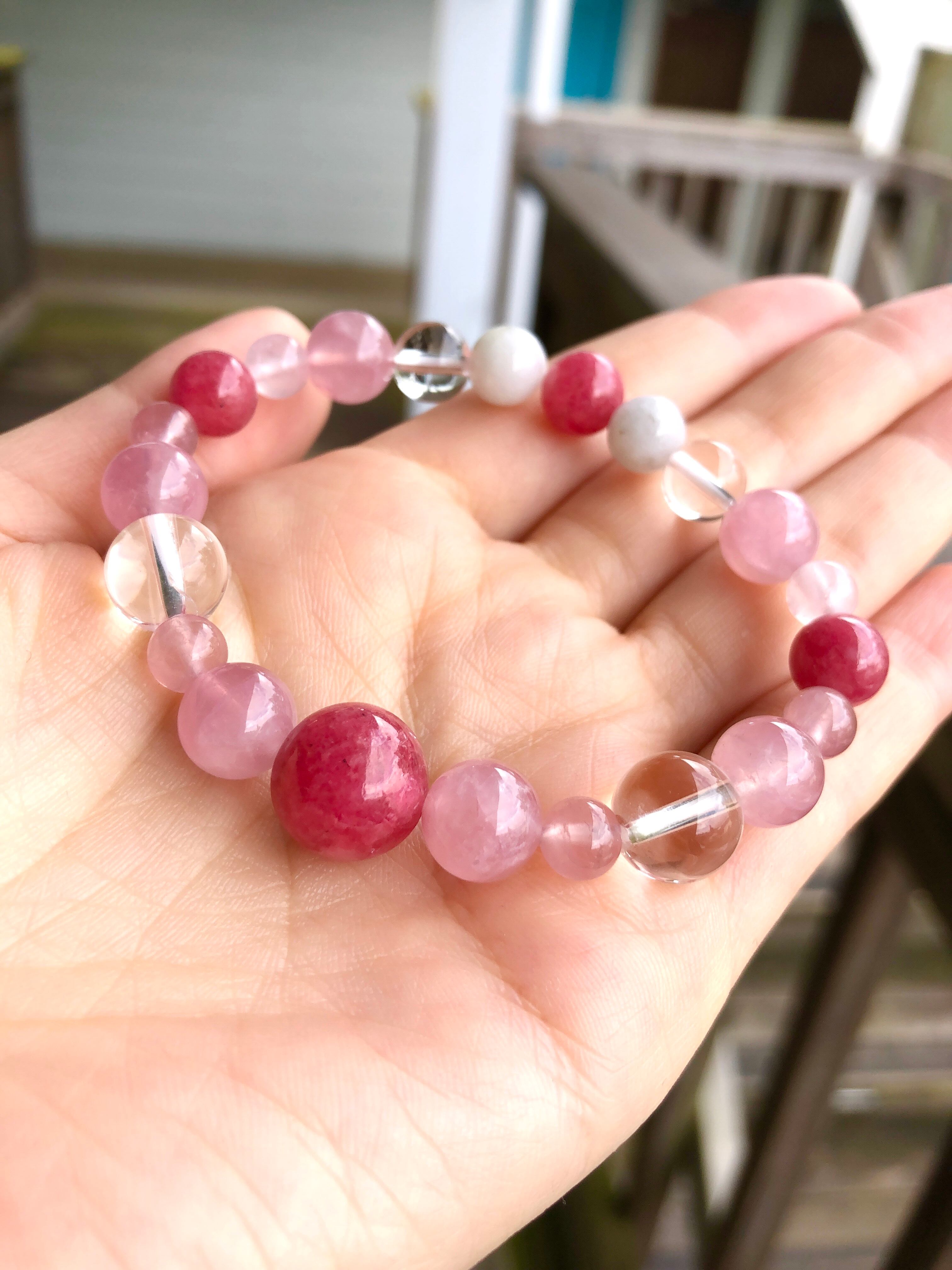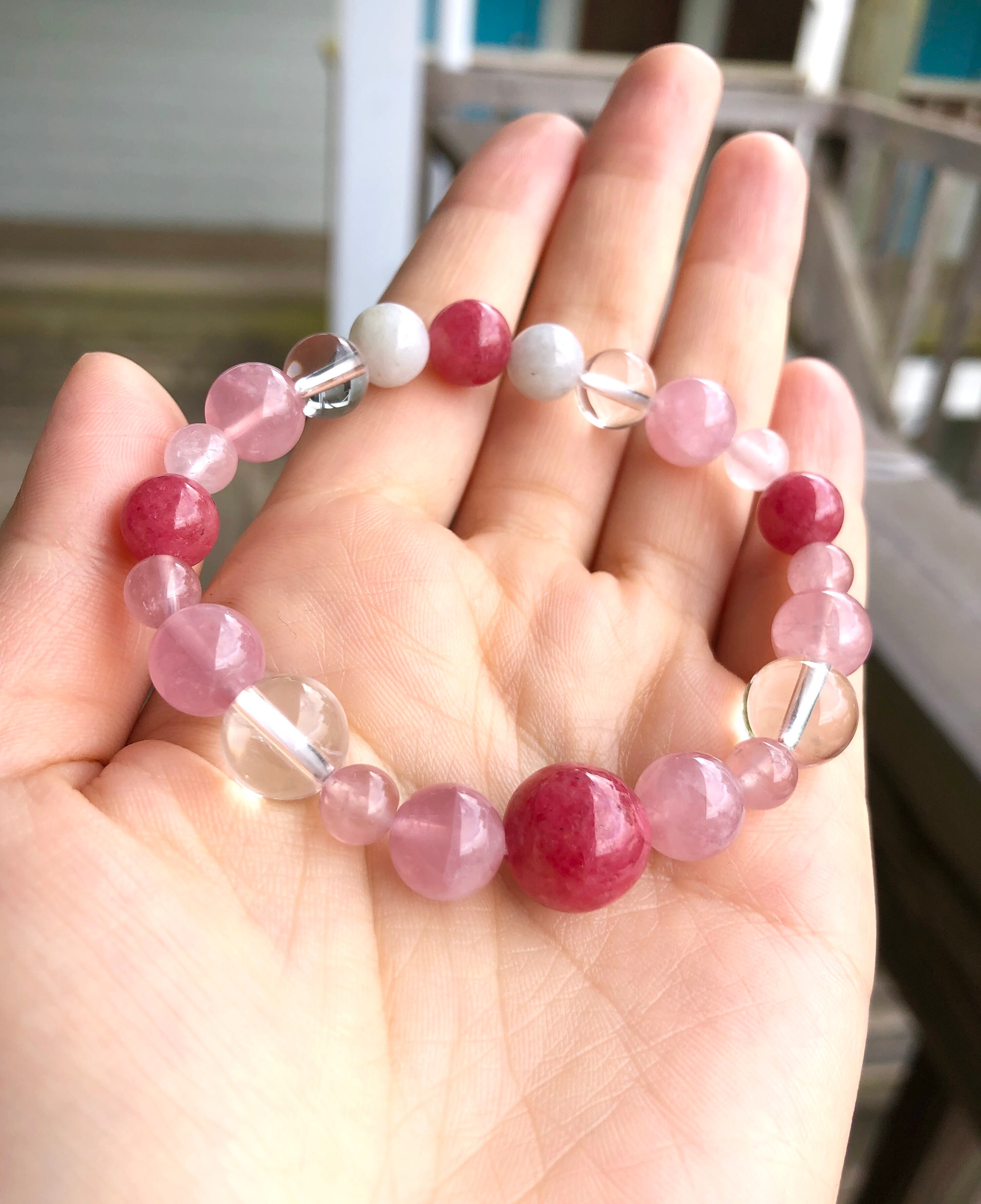 自己愛のためのブレス3部作の3つ目は、ローズクォーツ、ロードナイト、水晶、翡翠のブレス。