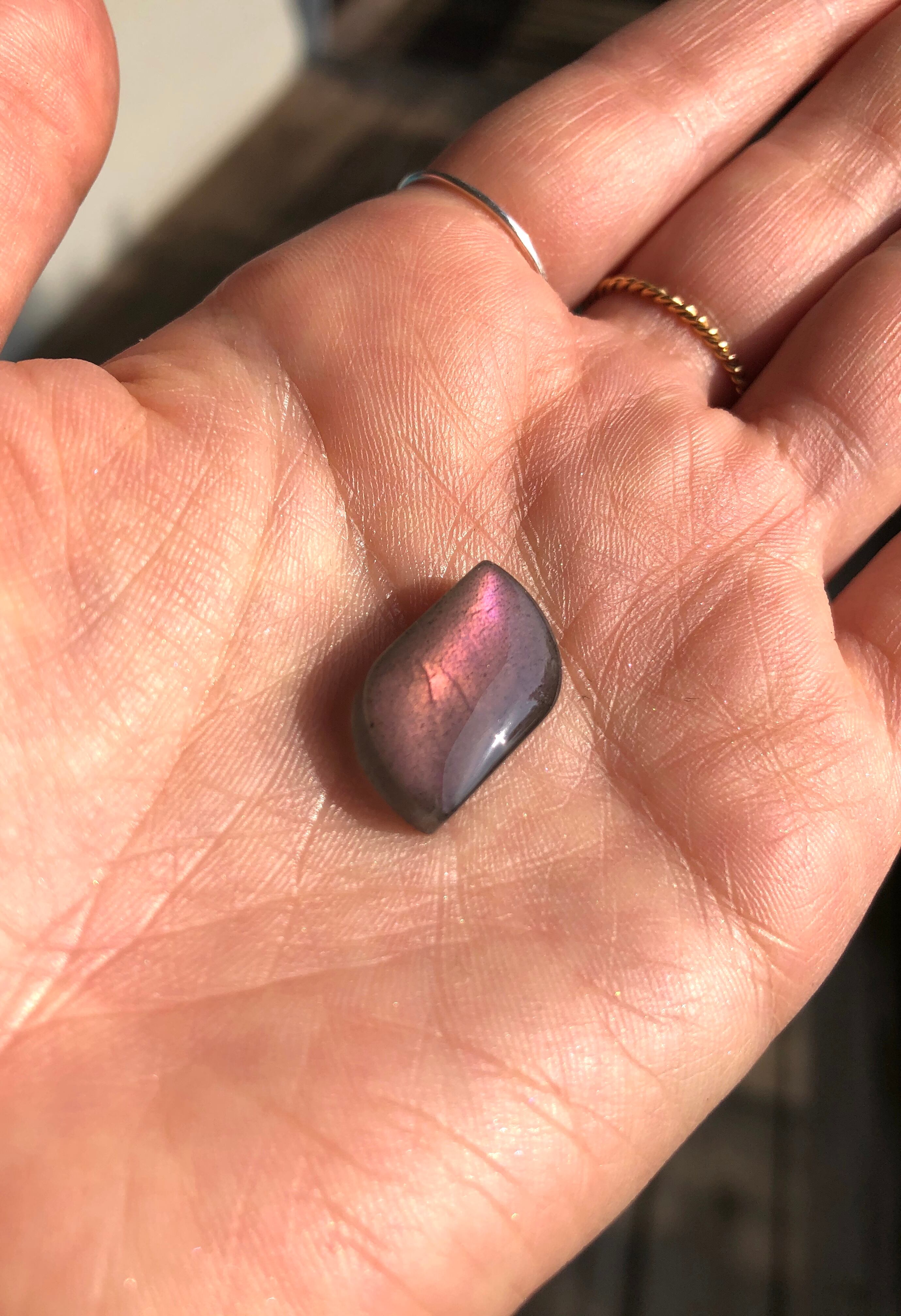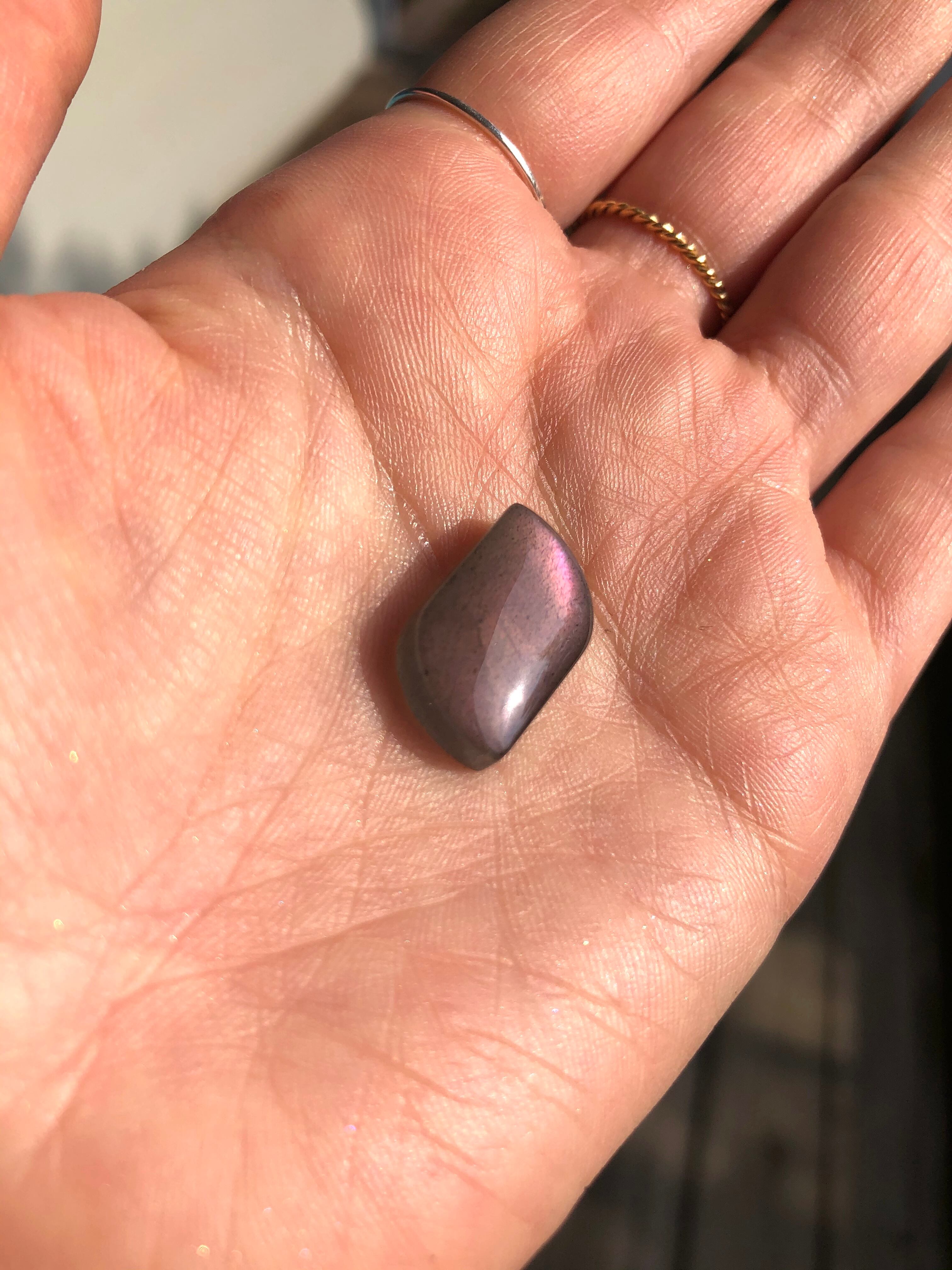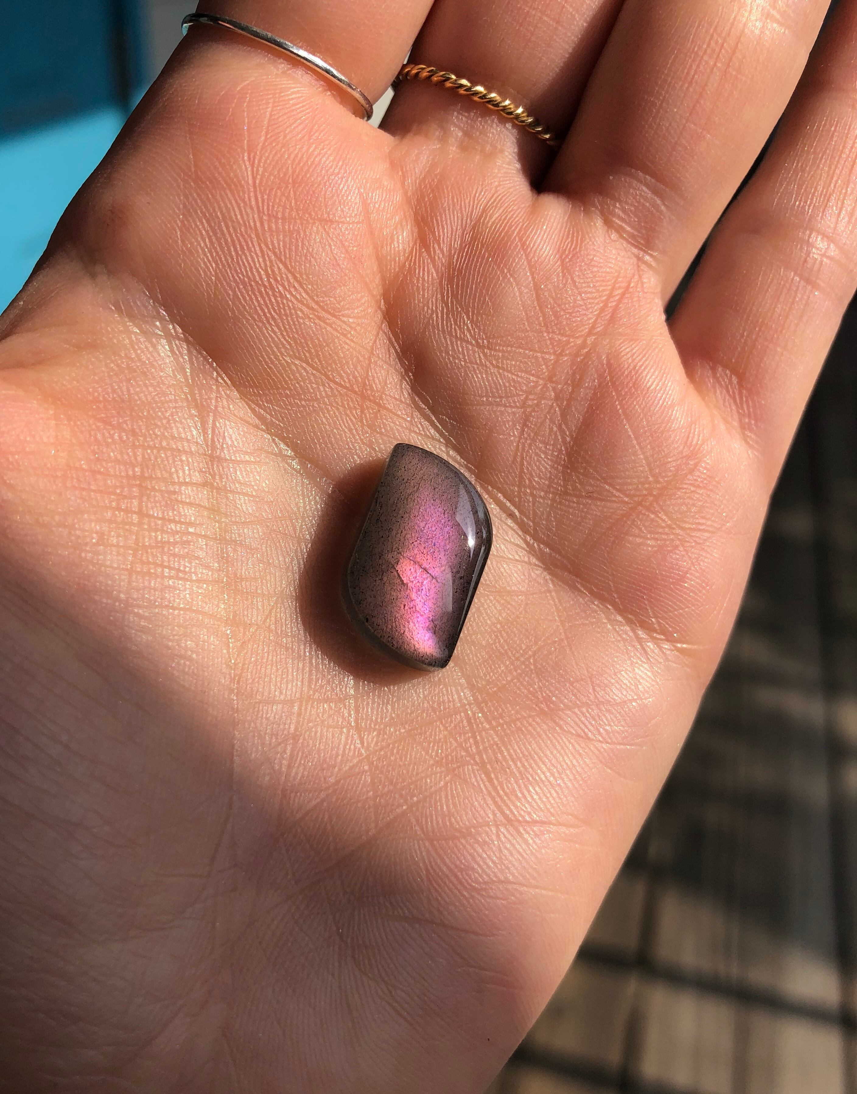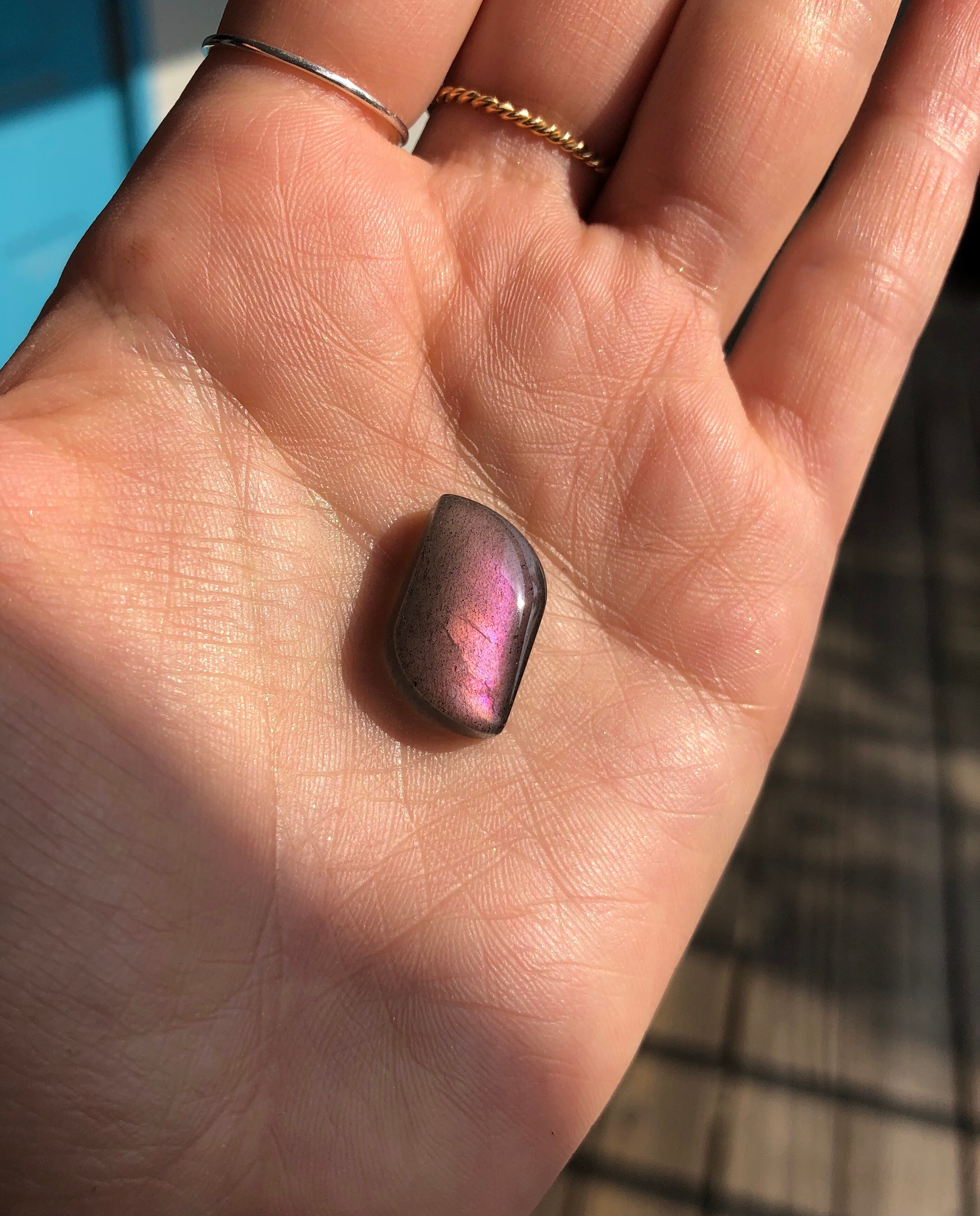 わたしはここまでの完成度が高いピンクラブラドライトは初めて見ました。ギラギラしておらず、とても品が良いのも素晴らしいです。