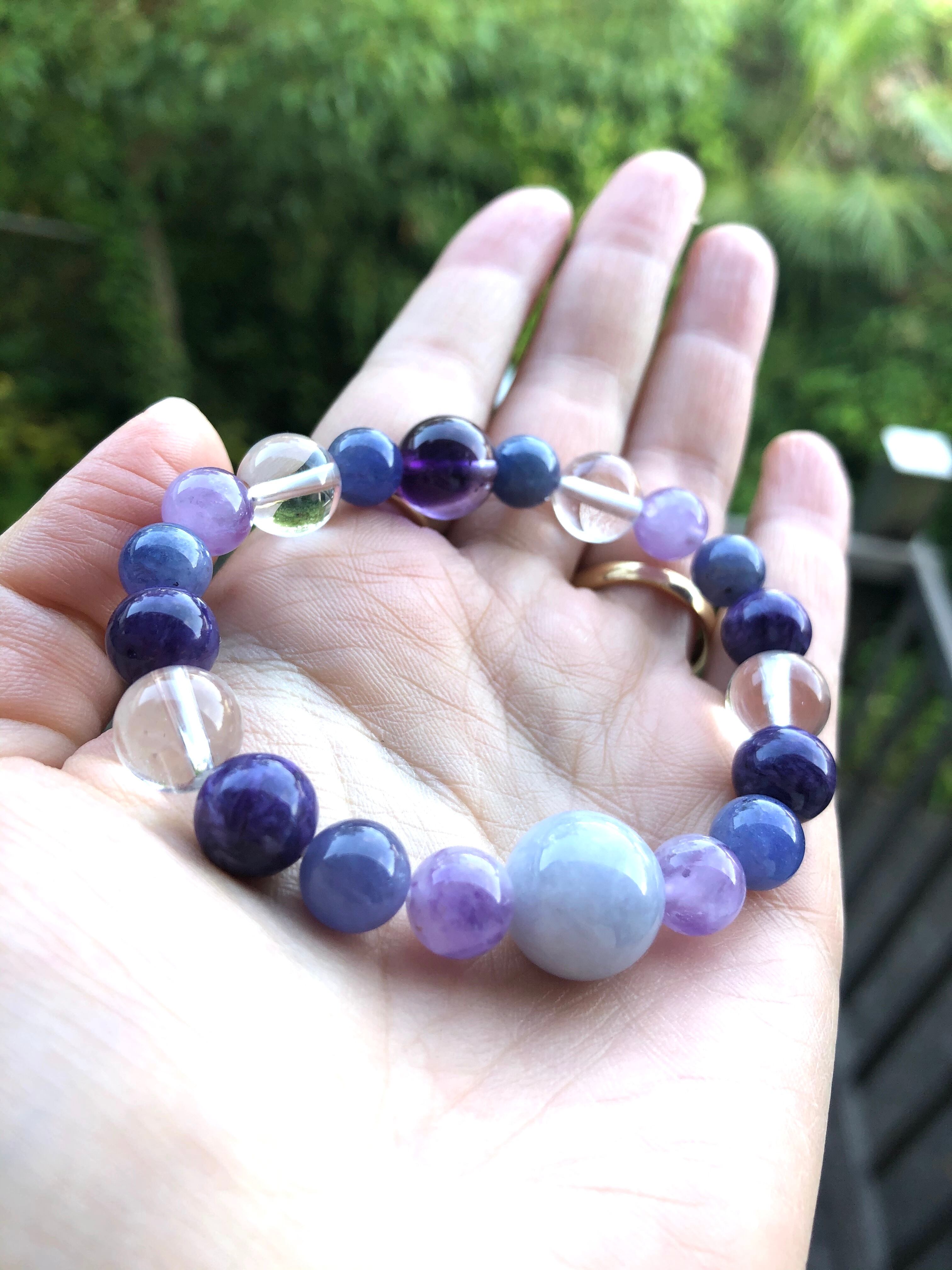 アメシスト、チャロアイト、タンザナイト、ラベンダー翡翠、水晶のブレスです。