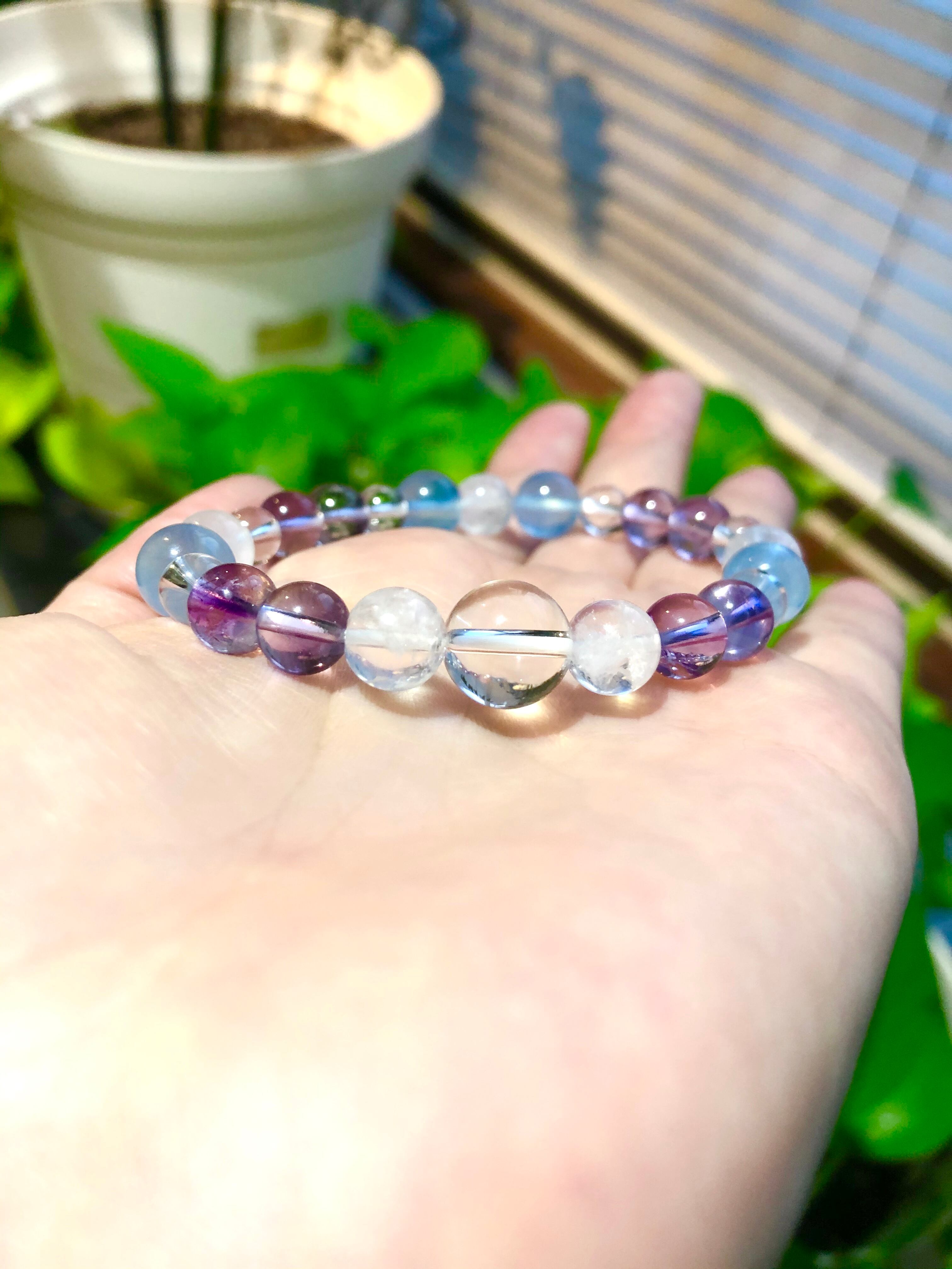 アクアマリン、レインボームーンストーン、水晶、スーパーセブンのブレスです。