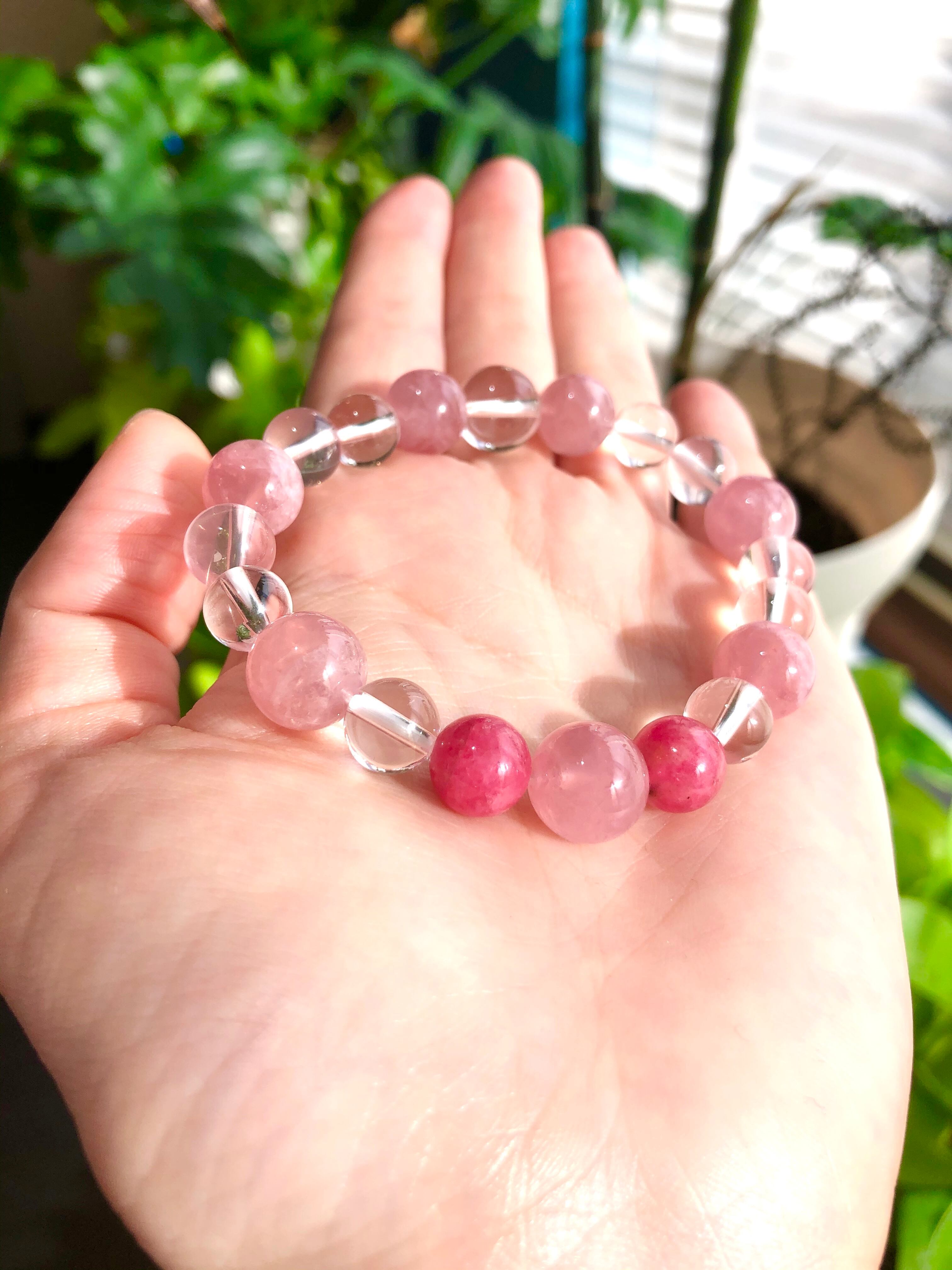 ロードナイト、ディープローズクォーツ、水晶、スターミルキークォーツのブレスです。