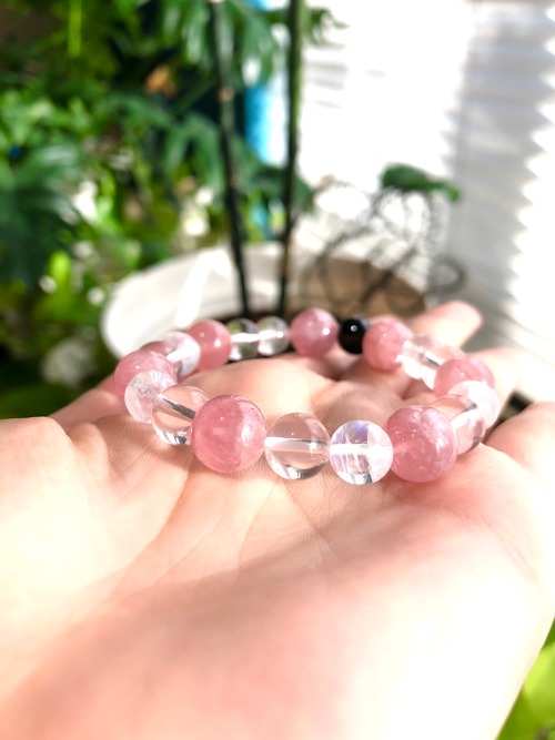 ディープローズクォーツ、レインボームーンクォーツ、スターミルキークォーツ、黒翡翠、ローズクォーツのブレスです。