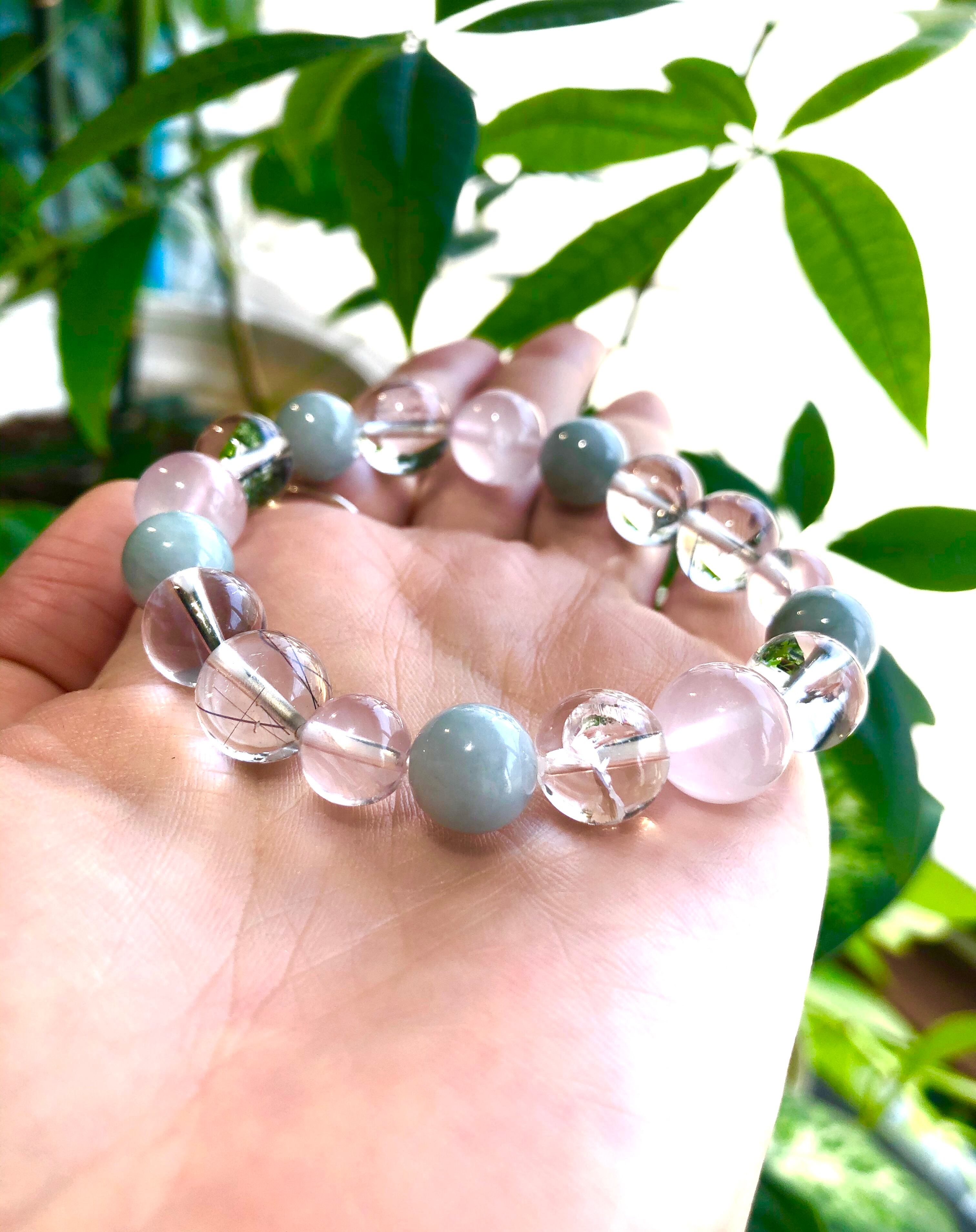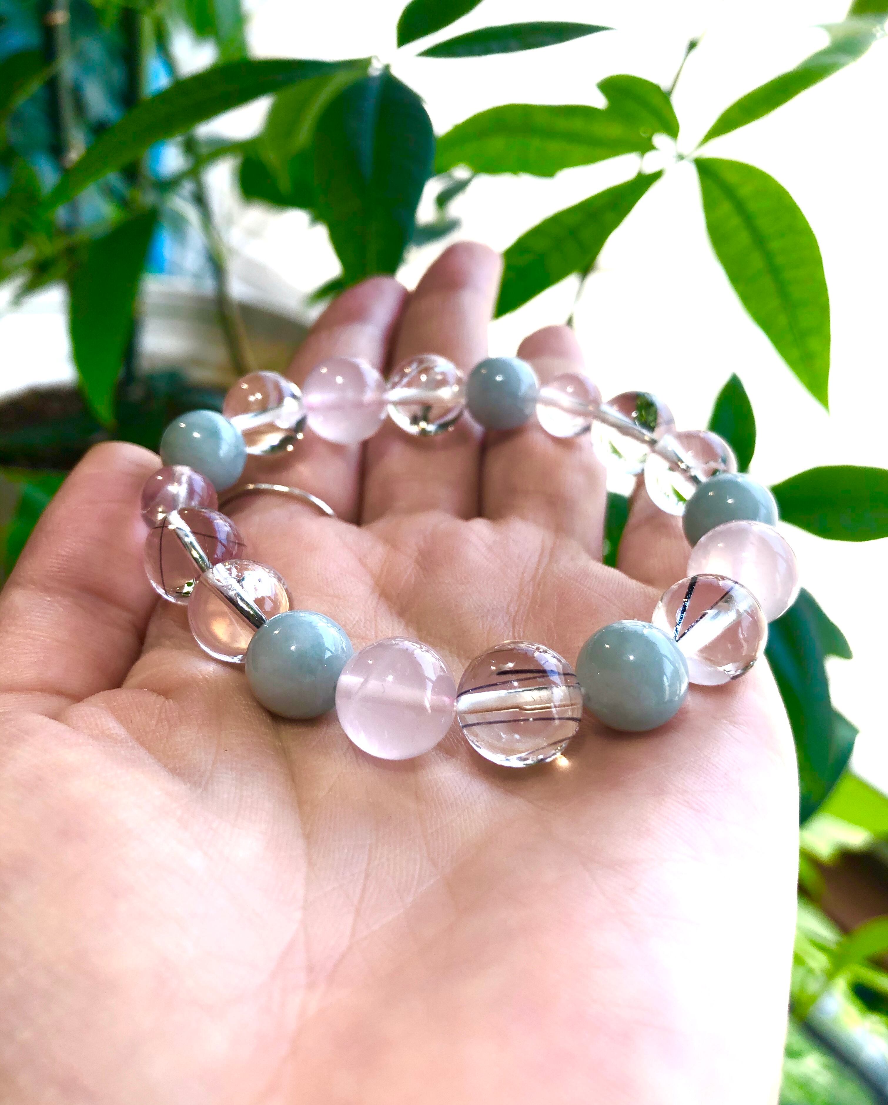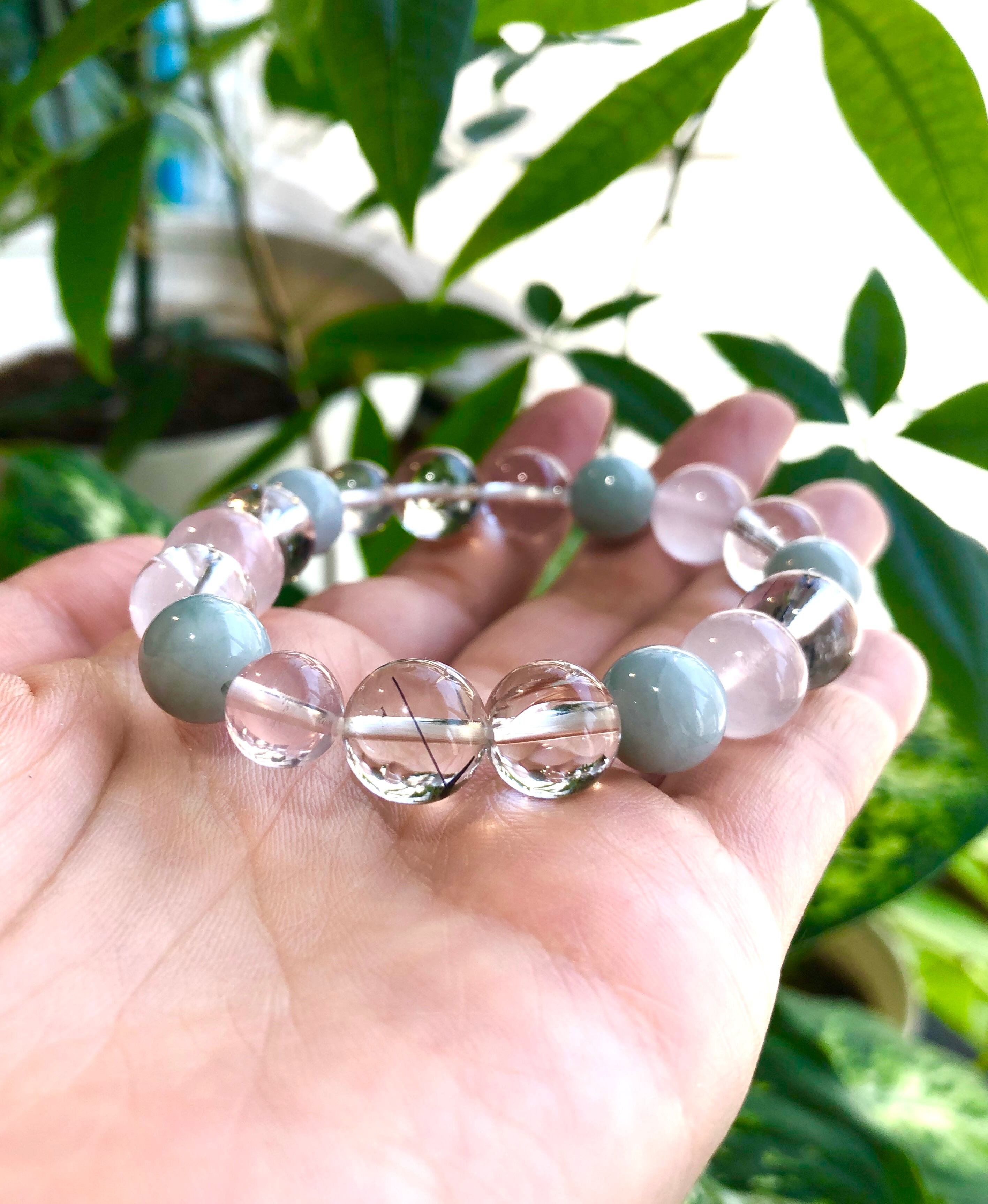 その1であるこのブレスは、ローズクォーツ、ブルールチルクォーツ、アイリスクォーツ、翡翠、スターローズクォーツでできています。
