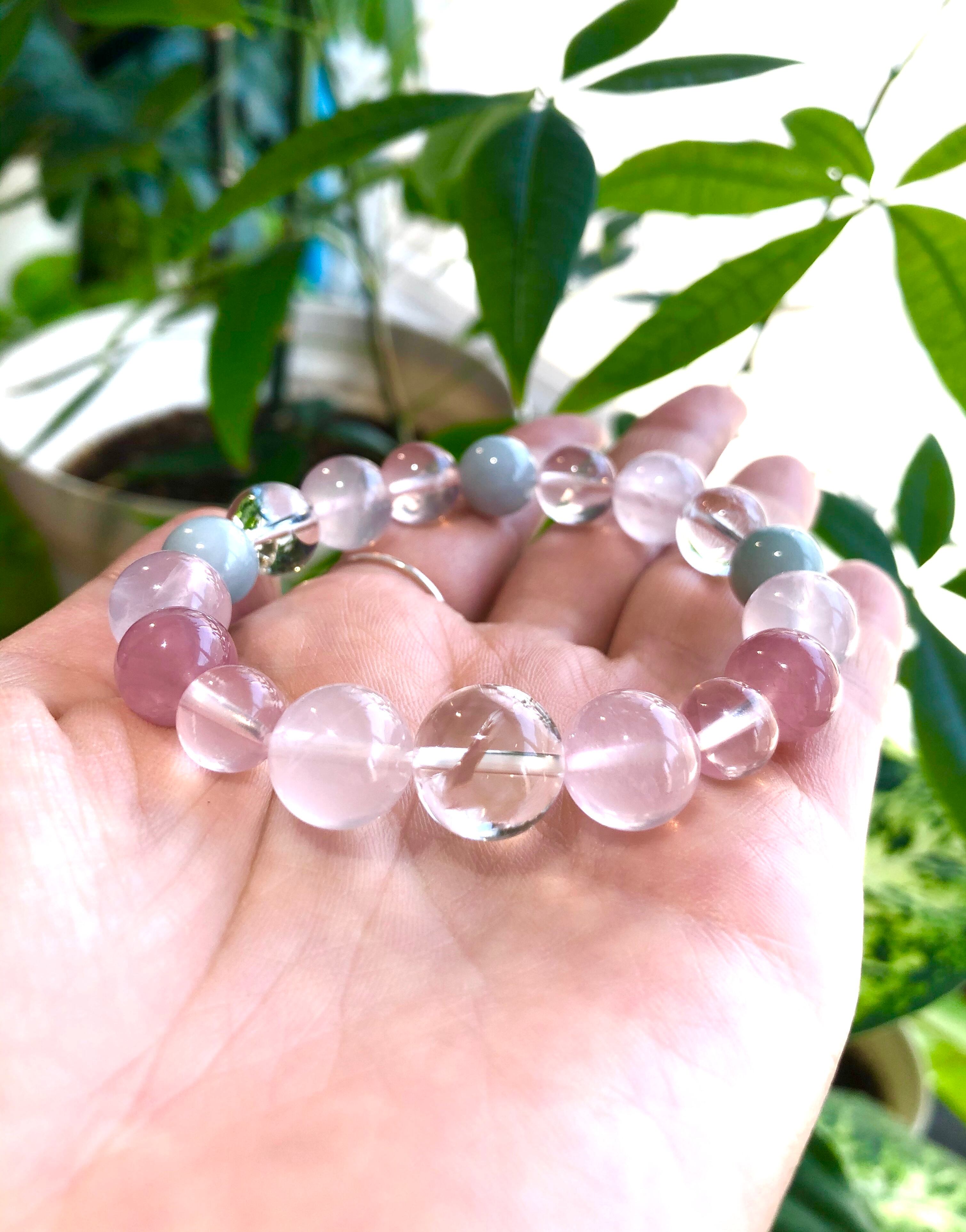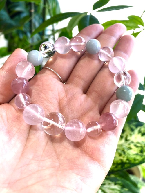 その2であるこのブレスは、ローズクォーツ、ブ。アイリスクォーツ、翡翠、スターローズクォーツ、ディープローズクォーツでできています。