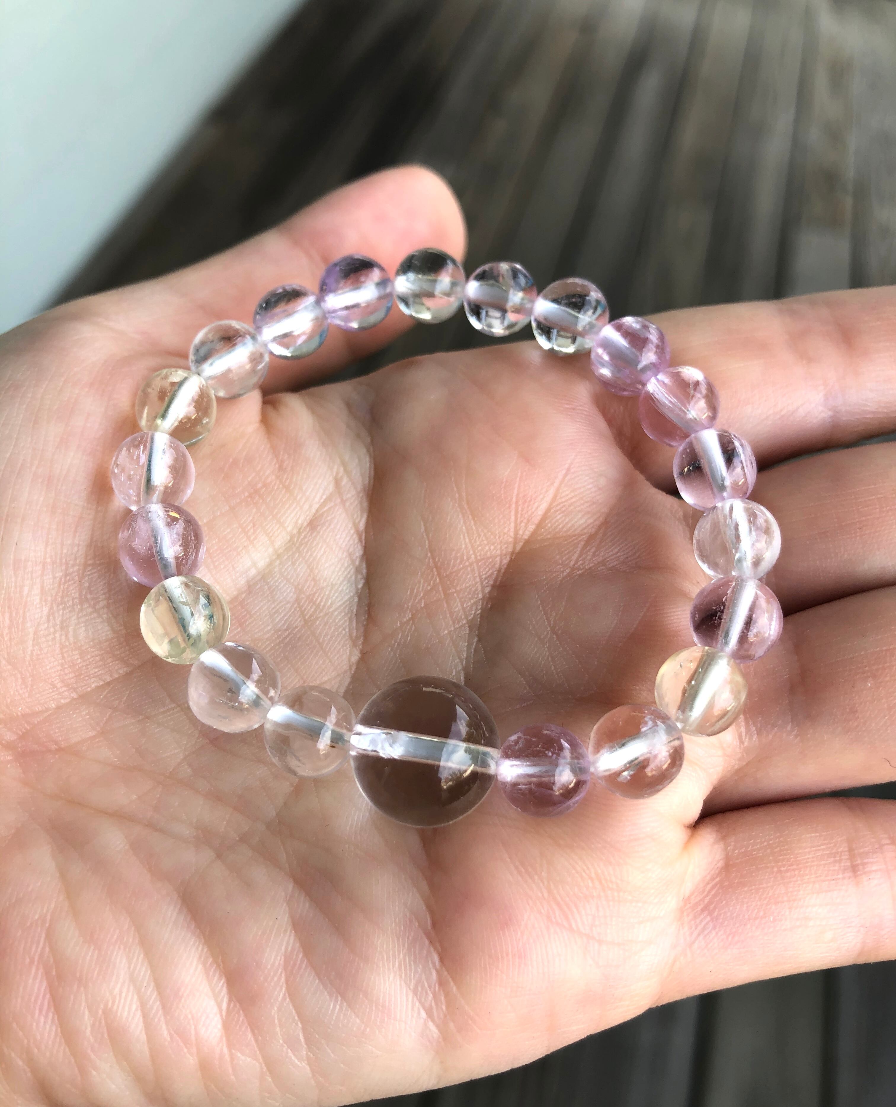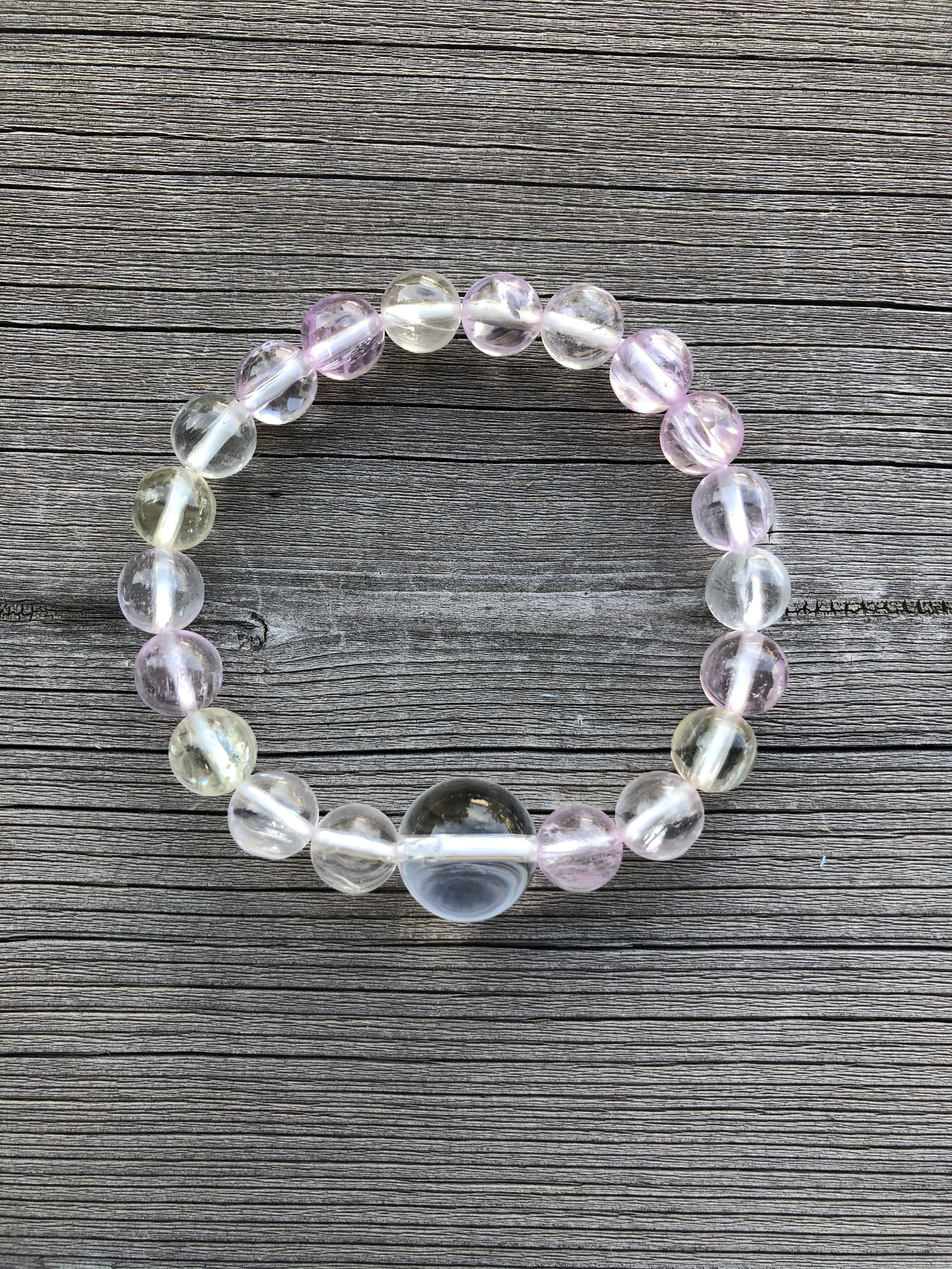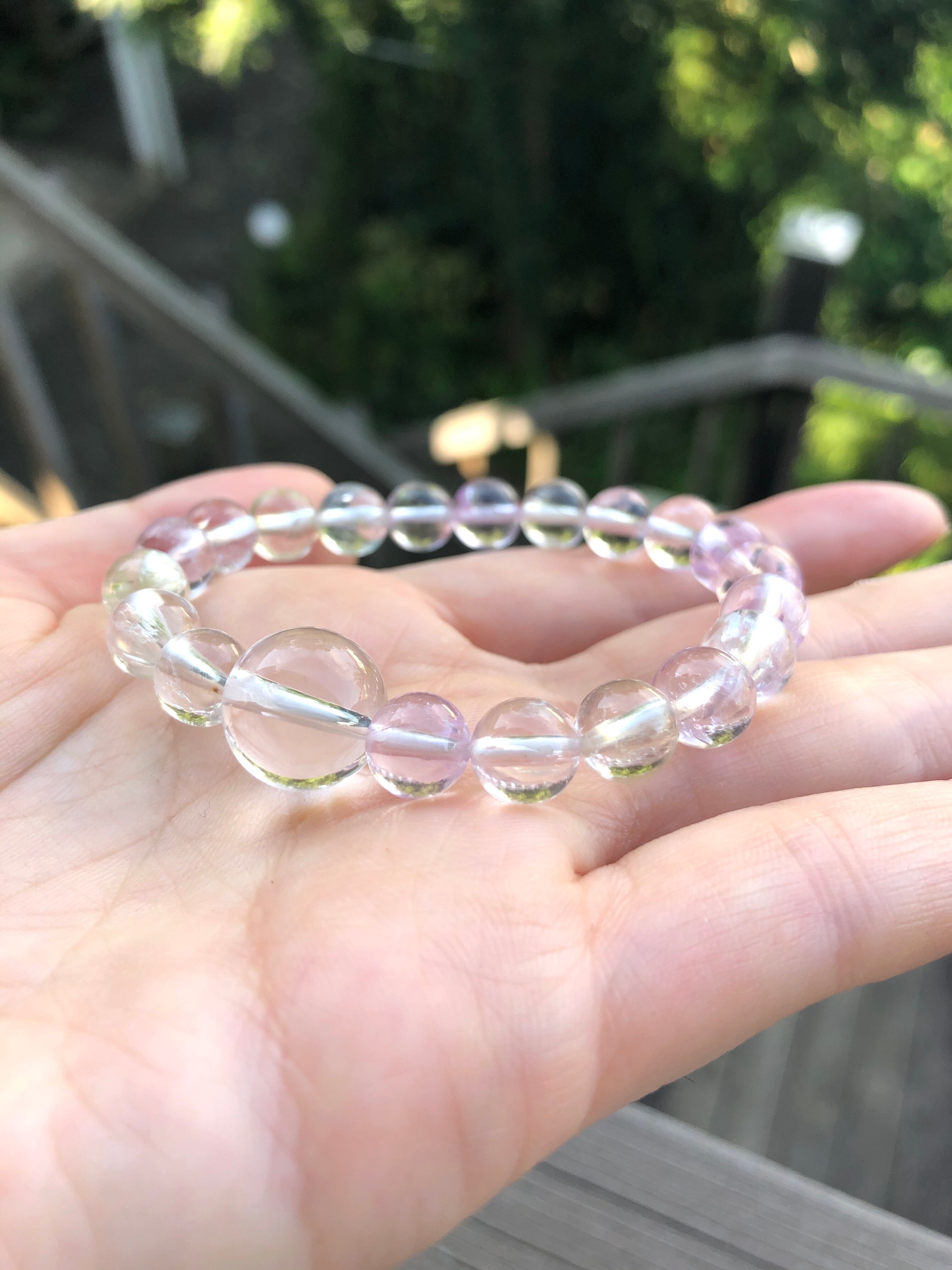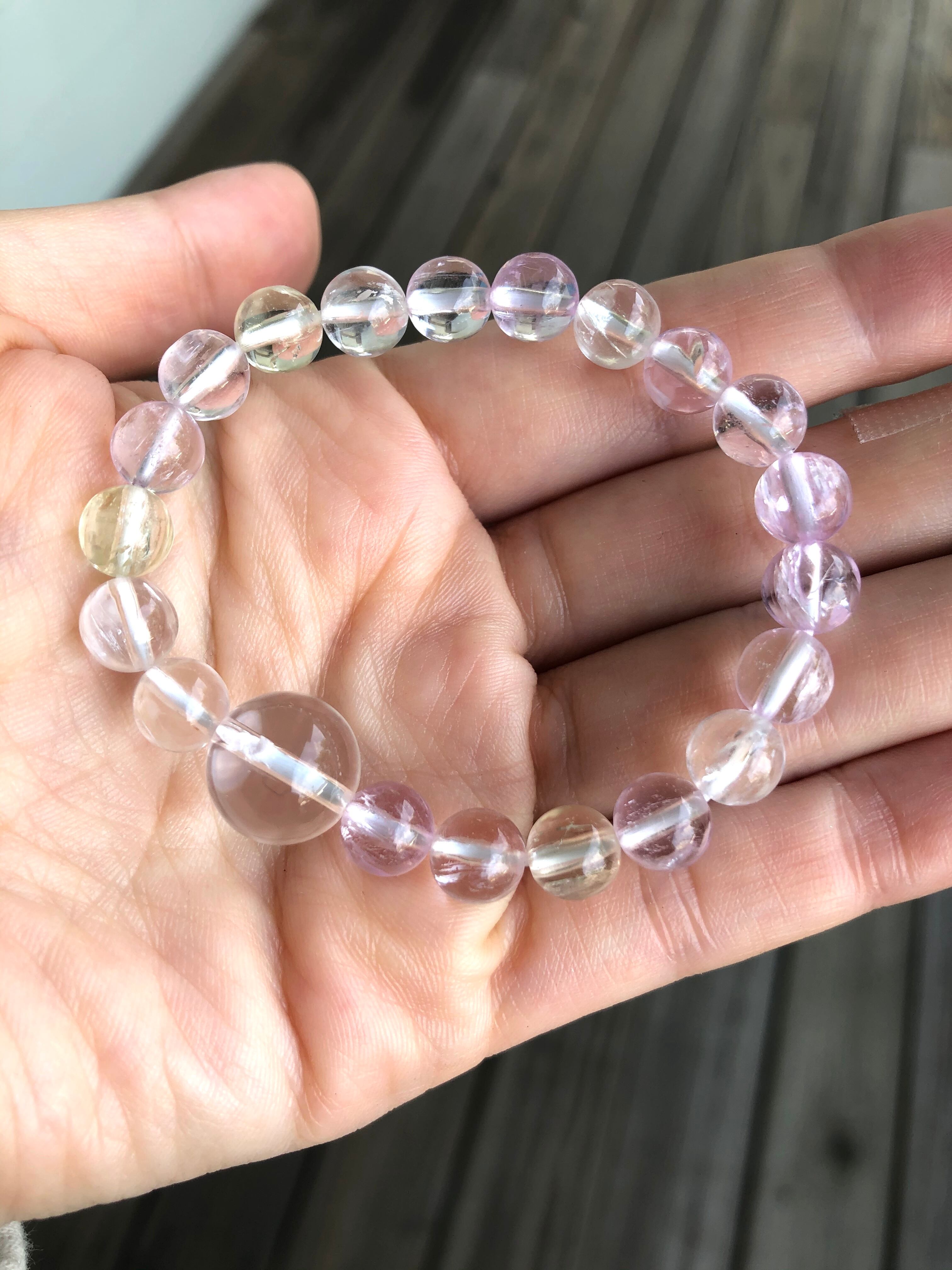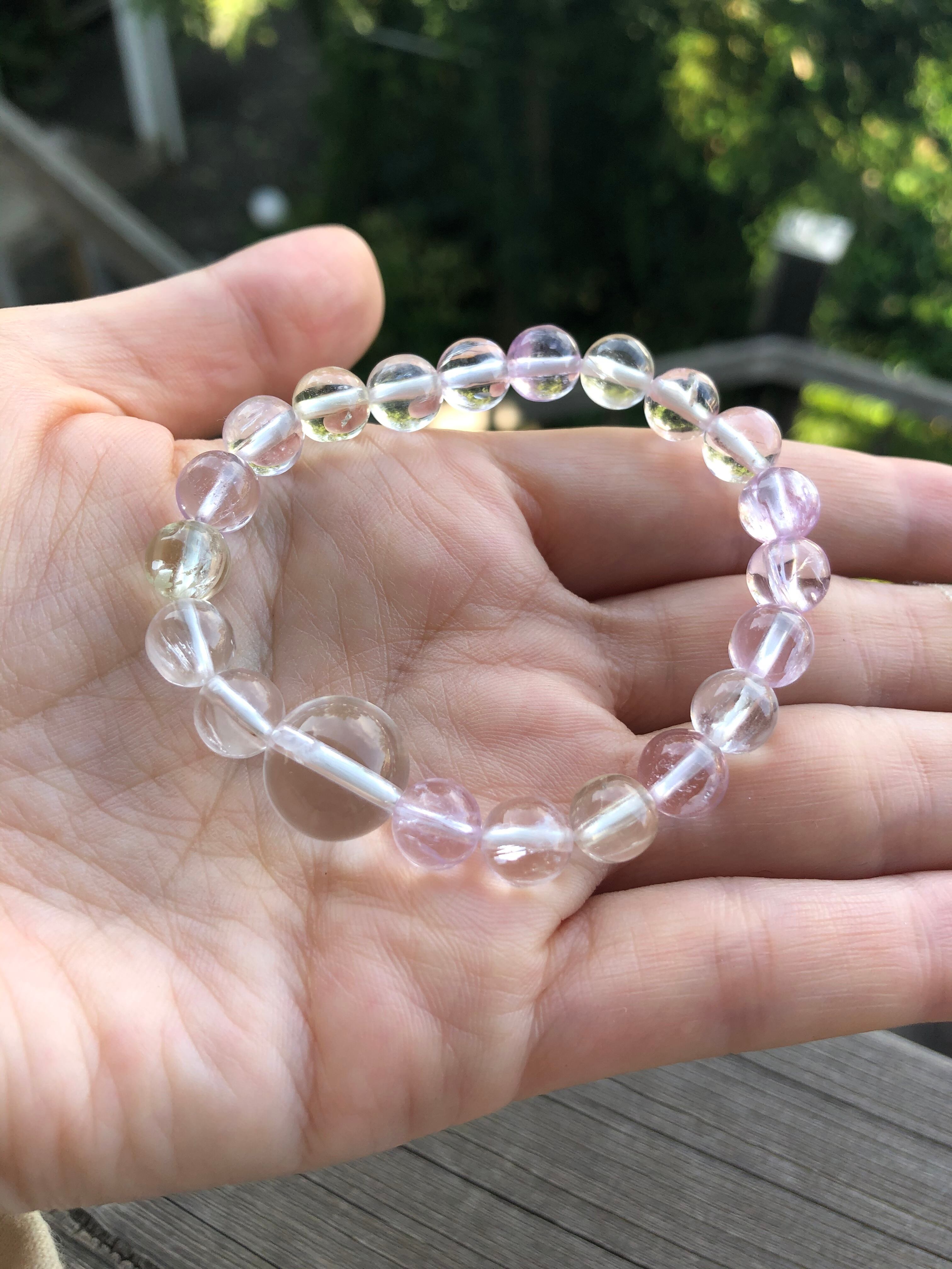 クンツァイト7ミリと水晶12ミリのブレスです。