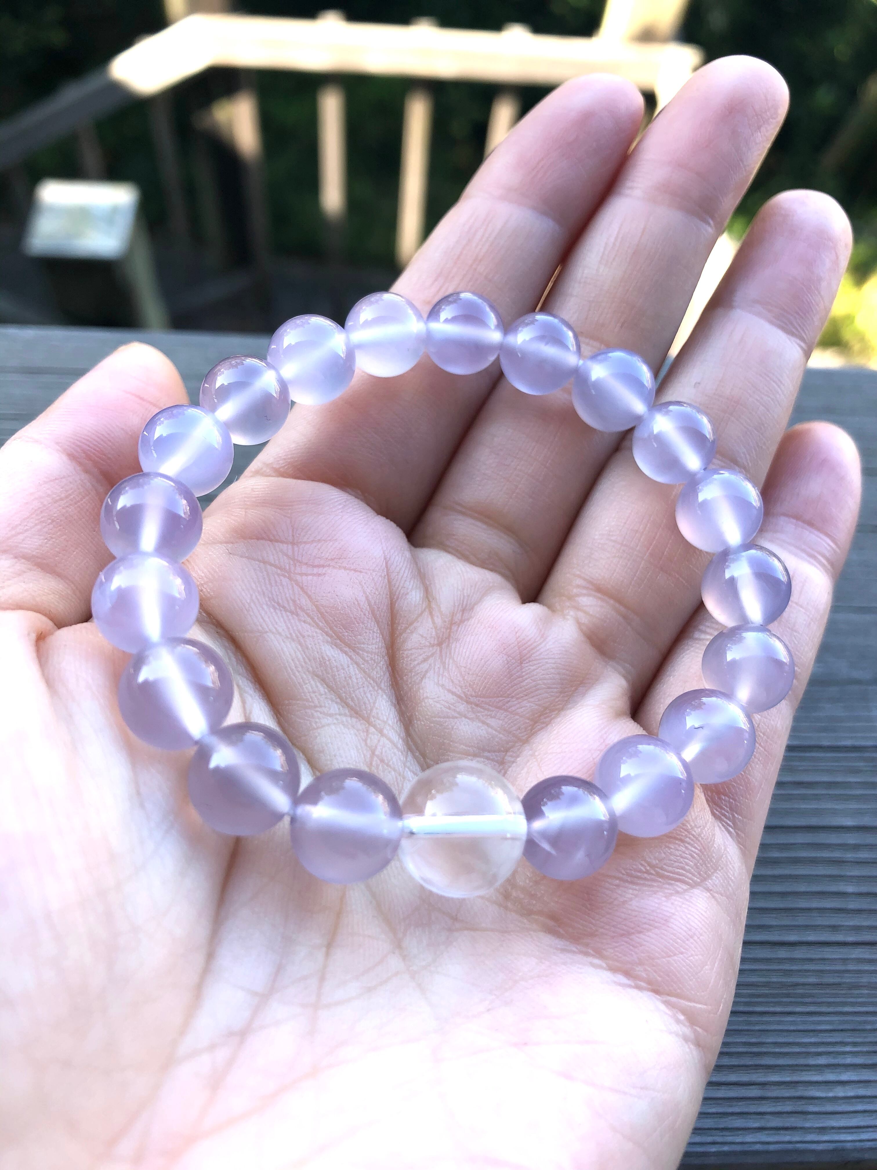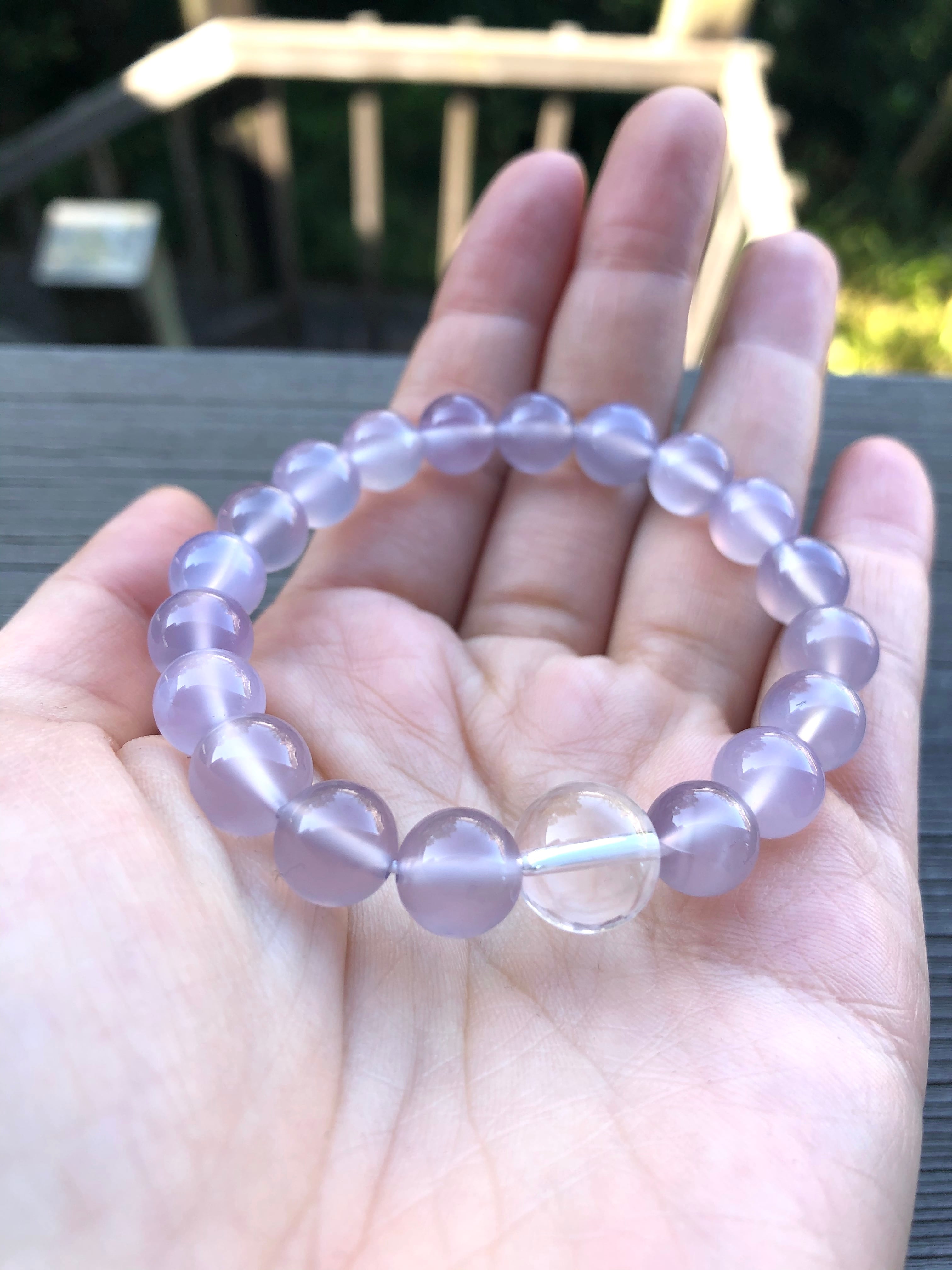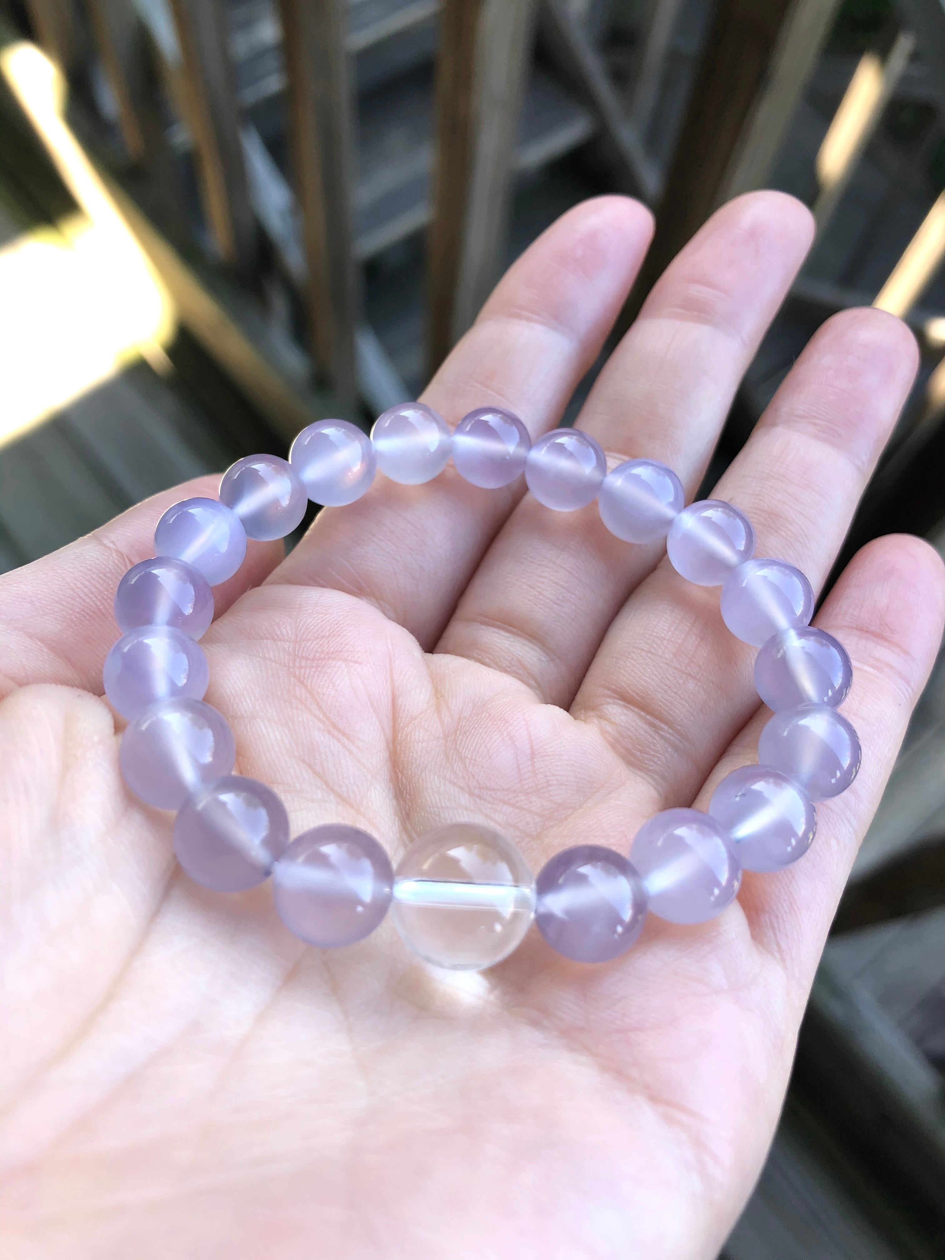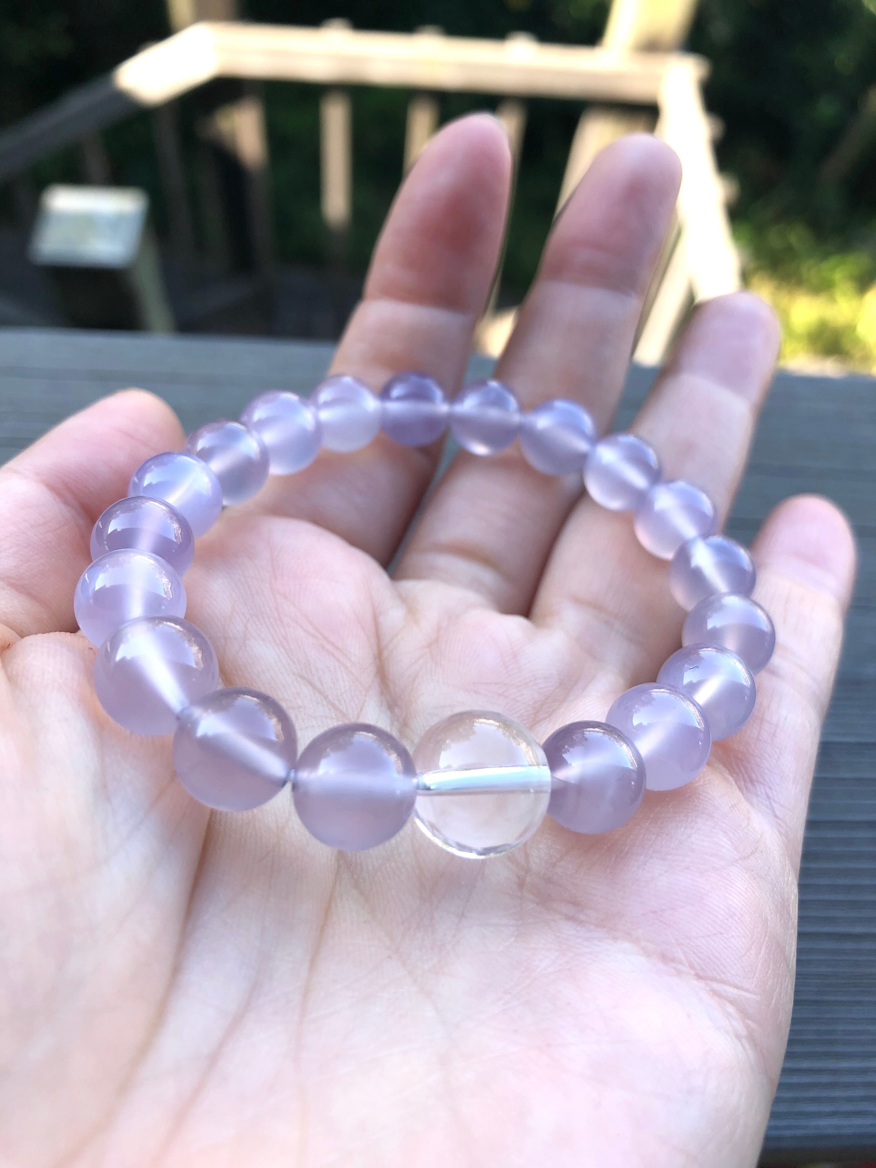 天然のパープルカルセドニー8mm と水晶のブレスです。
