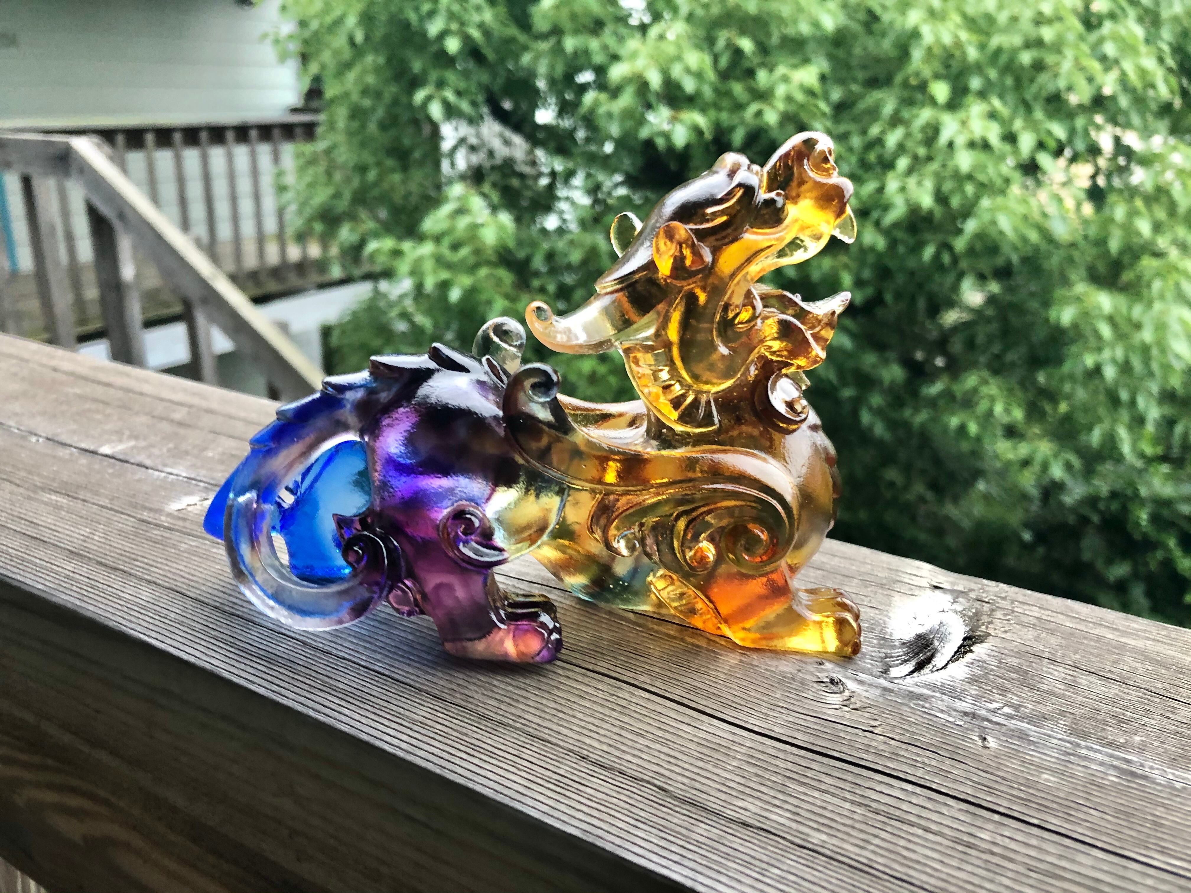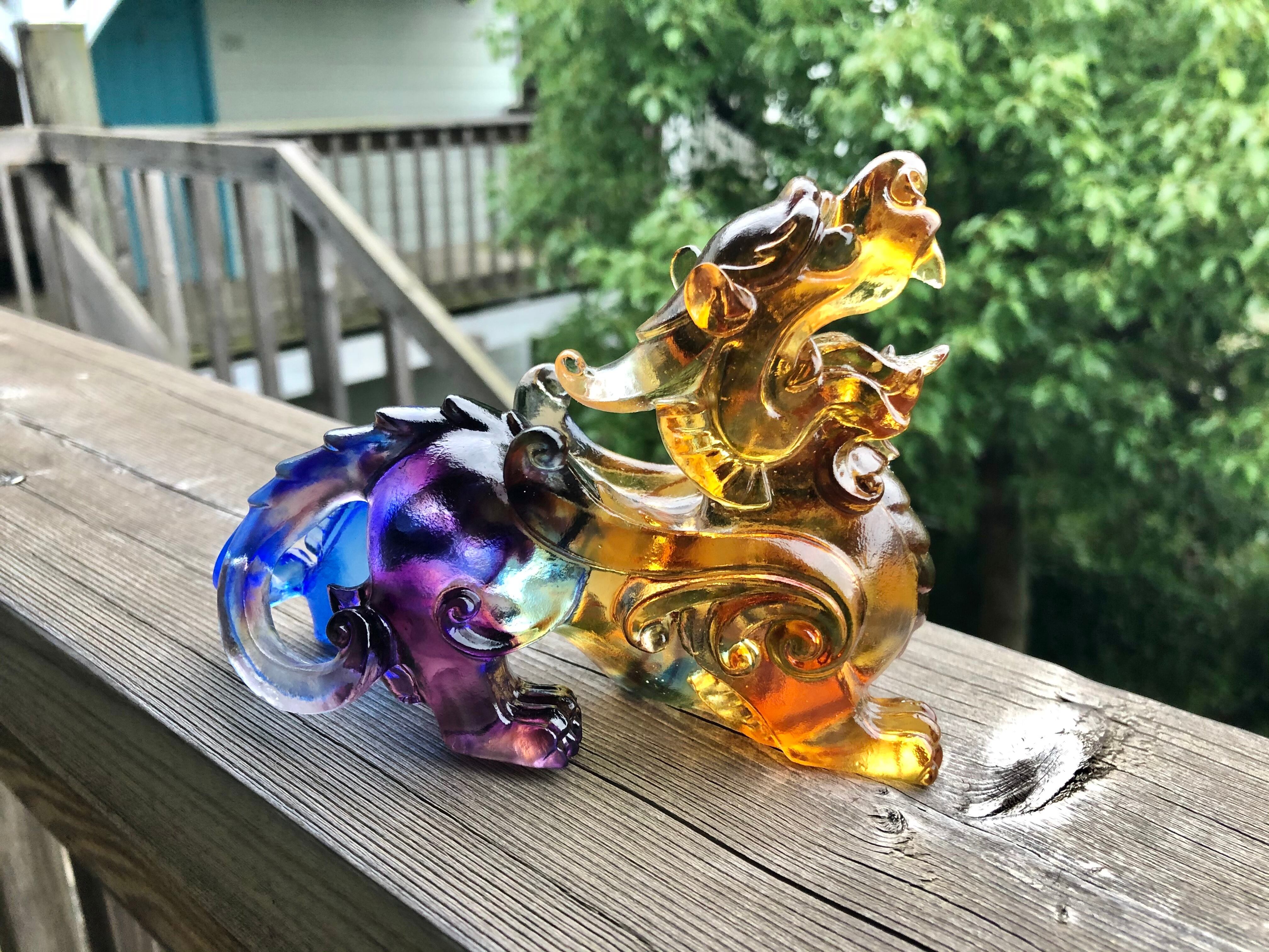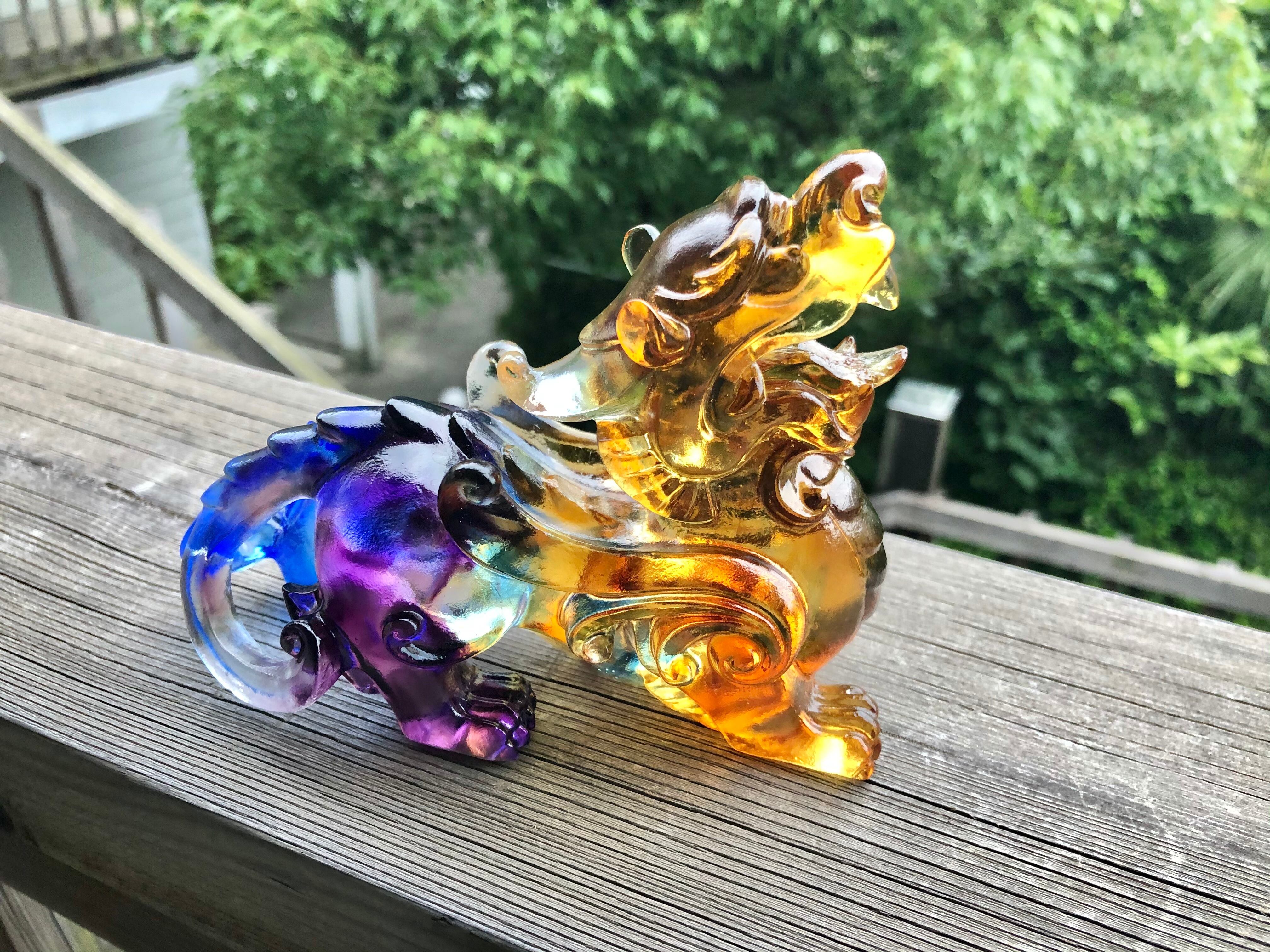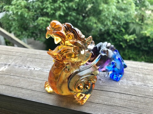 こちらは貔貅(ひきゅう)。金を食べて、お尻には穴がないので、金を体内に溜め込むという伝説から、蓄財のお守りとして有名。貔貅をかたどった縁起物を建物の外側に向けて置けば財気を吸収するとも言われます。
