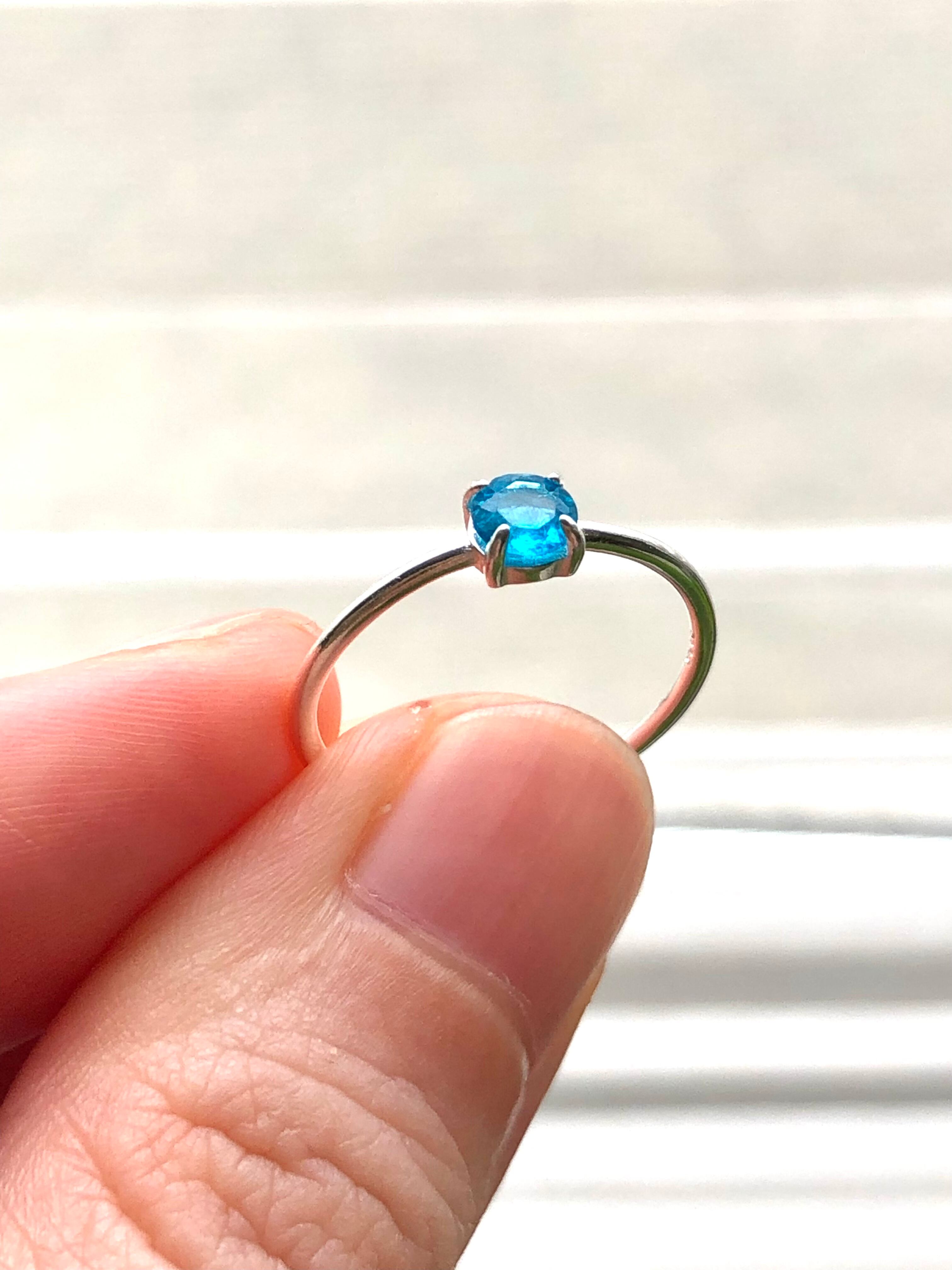 約0.25カラット、約4×4mmの宝石質ネオンブルーカラーのアパタイトのシルバーリングです。