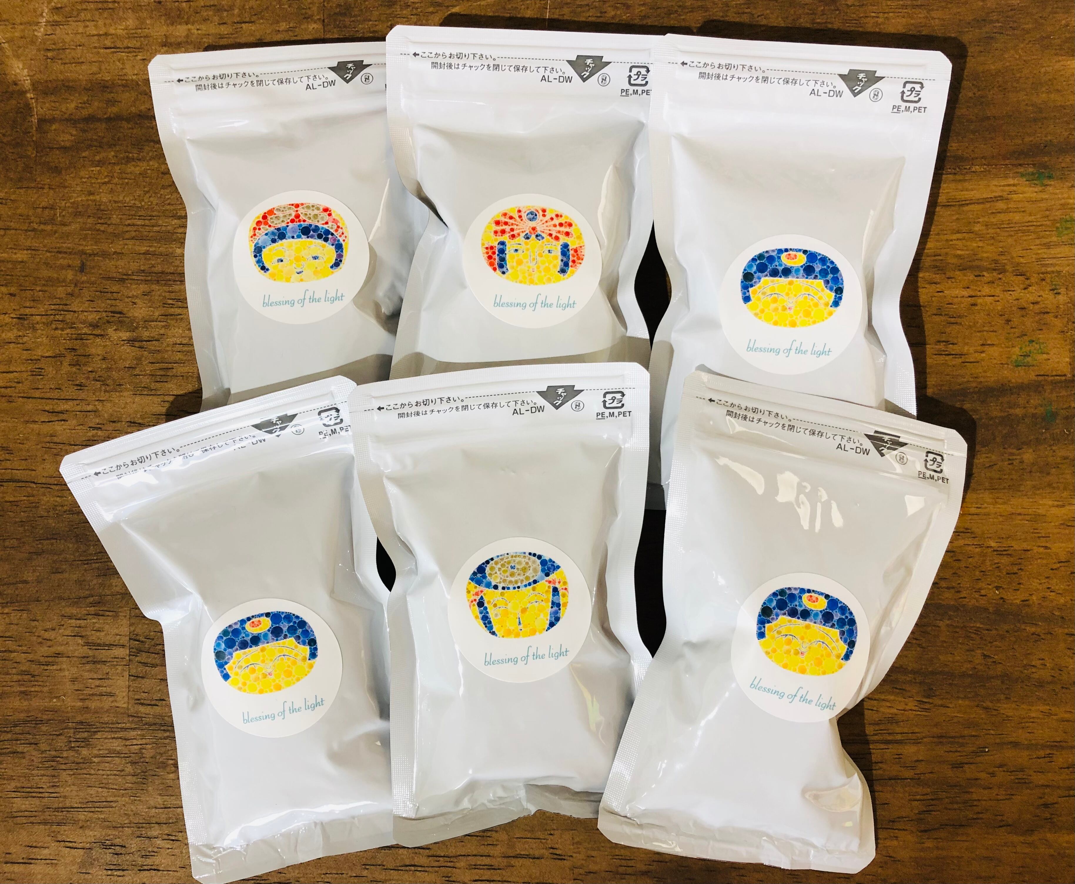 こちらは《新鮮でワクワクする挑戦とチャンスの波に乗る》というテーマでお作りしたバスソルトミニパック8個を同梱でお送りします。(1パックにつき一回分〜2回分です)*画像は6個ですが、実際には8個お送りします。