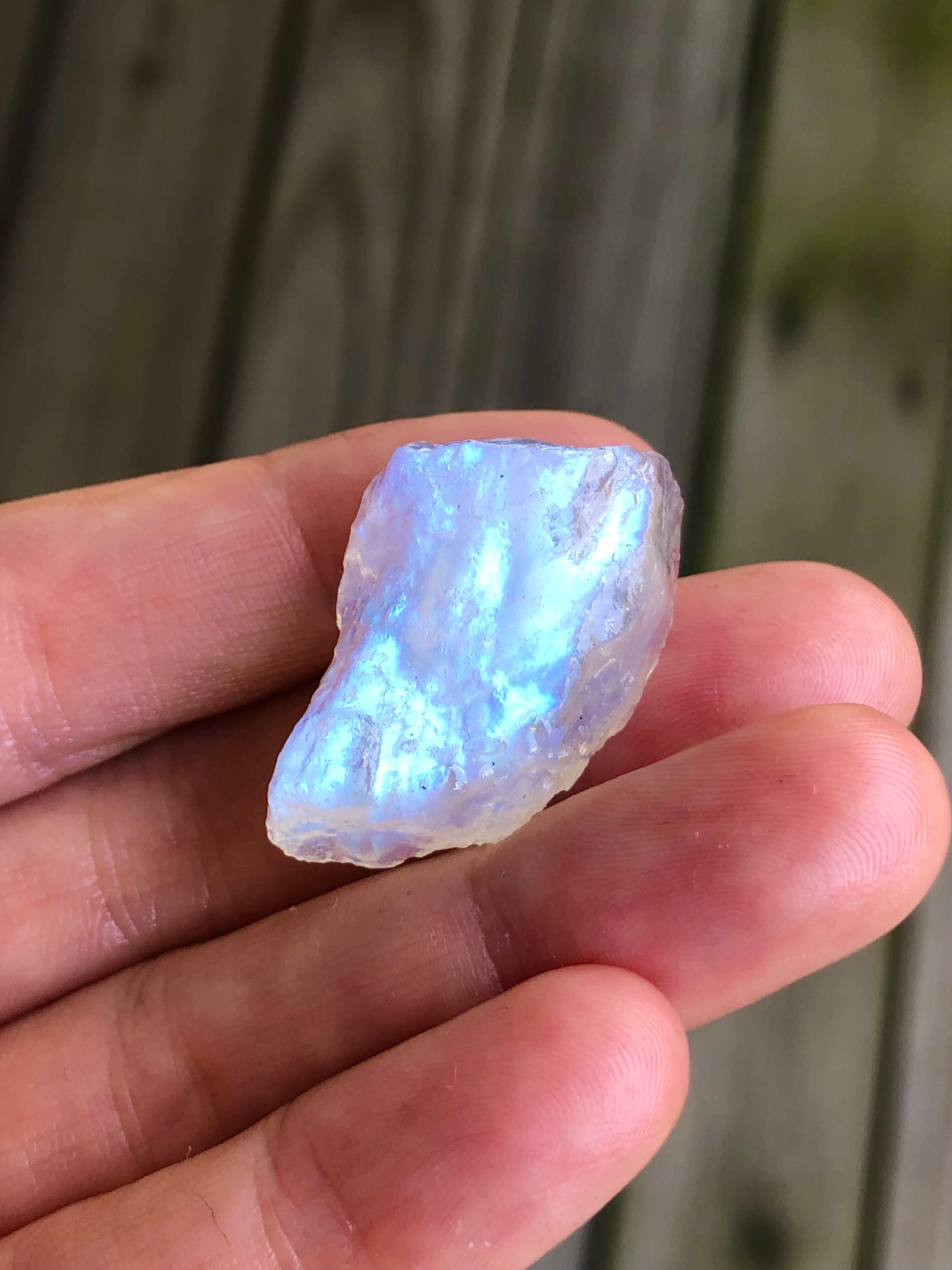 こんなにもシラーが美しくはっきりと見られるホワイトラブラドライトの原石を手にしたのは初めてです。