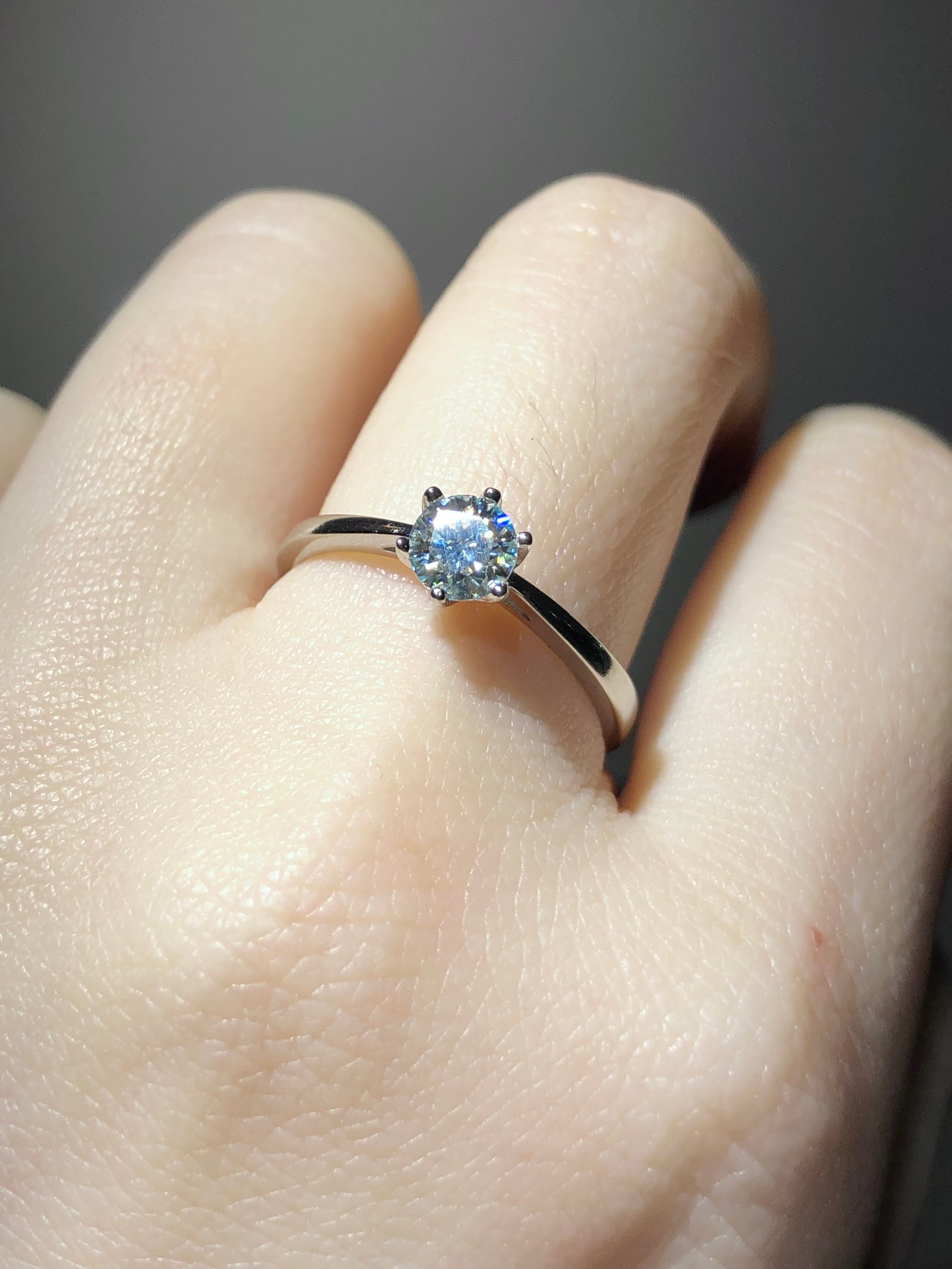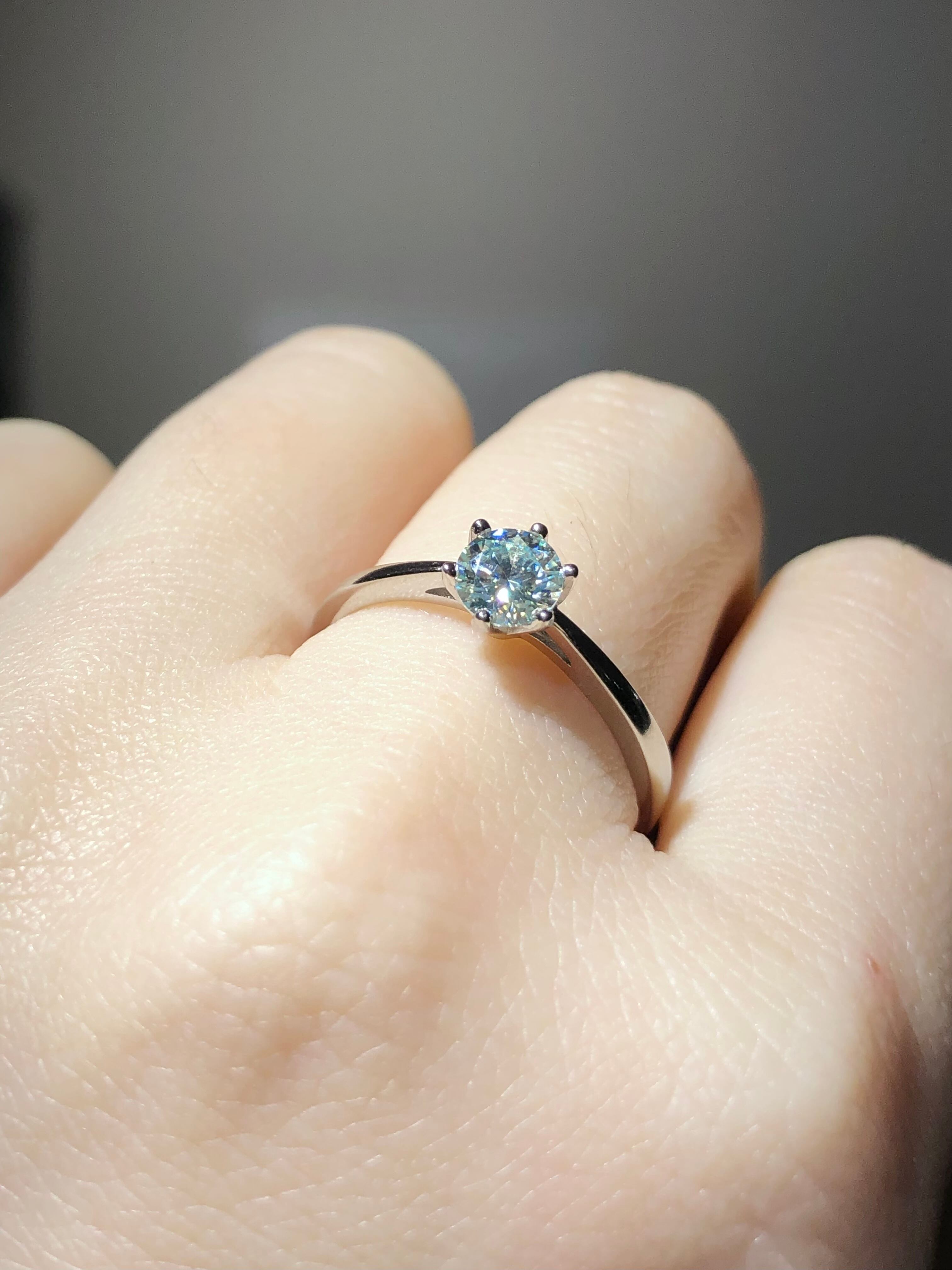 モアサナイトは、宝石の輝きを表す「ファイア」においてダイヤモンドの2.5倍で、皮脂などが付着しやすいダイヤモンドに比べてそれも少なくメンテナンスもしやすいそうです。もちろん硬度も高いそう。
