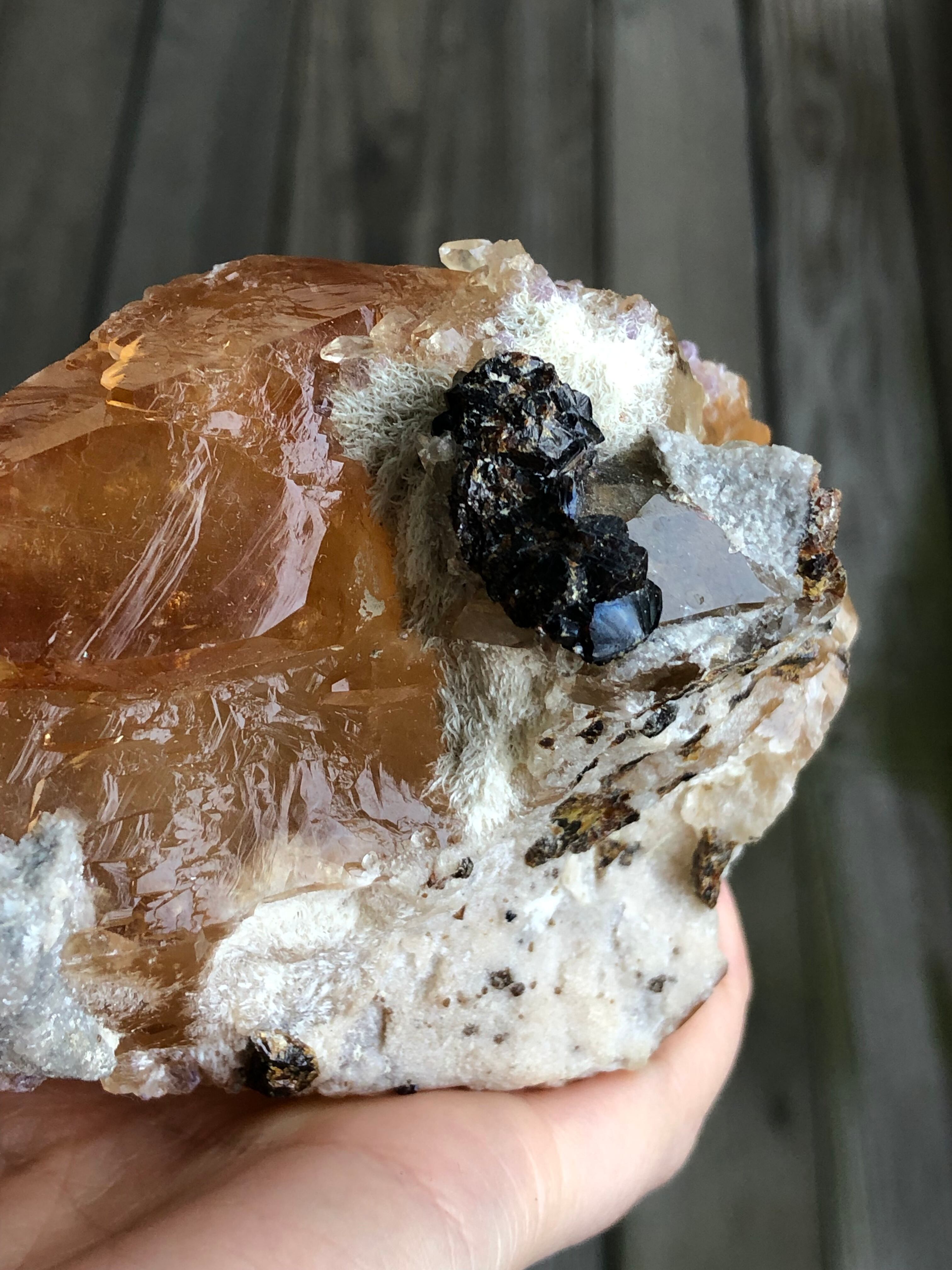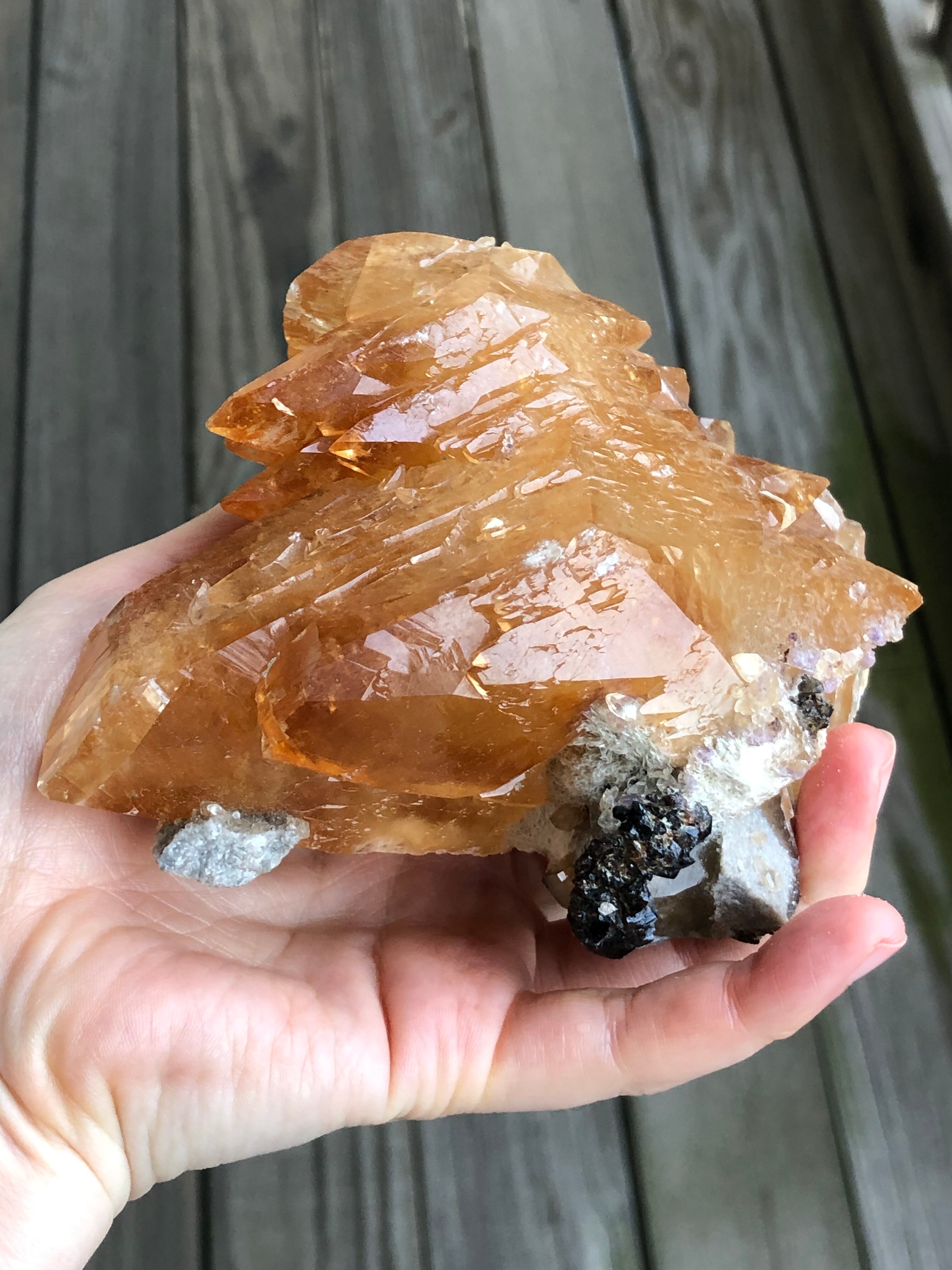 かなりの高品質で、龍の鱗のような結晶もしっかり見られ、スファレライトの黒い結晶もしっかり付いていて、パワフルです。