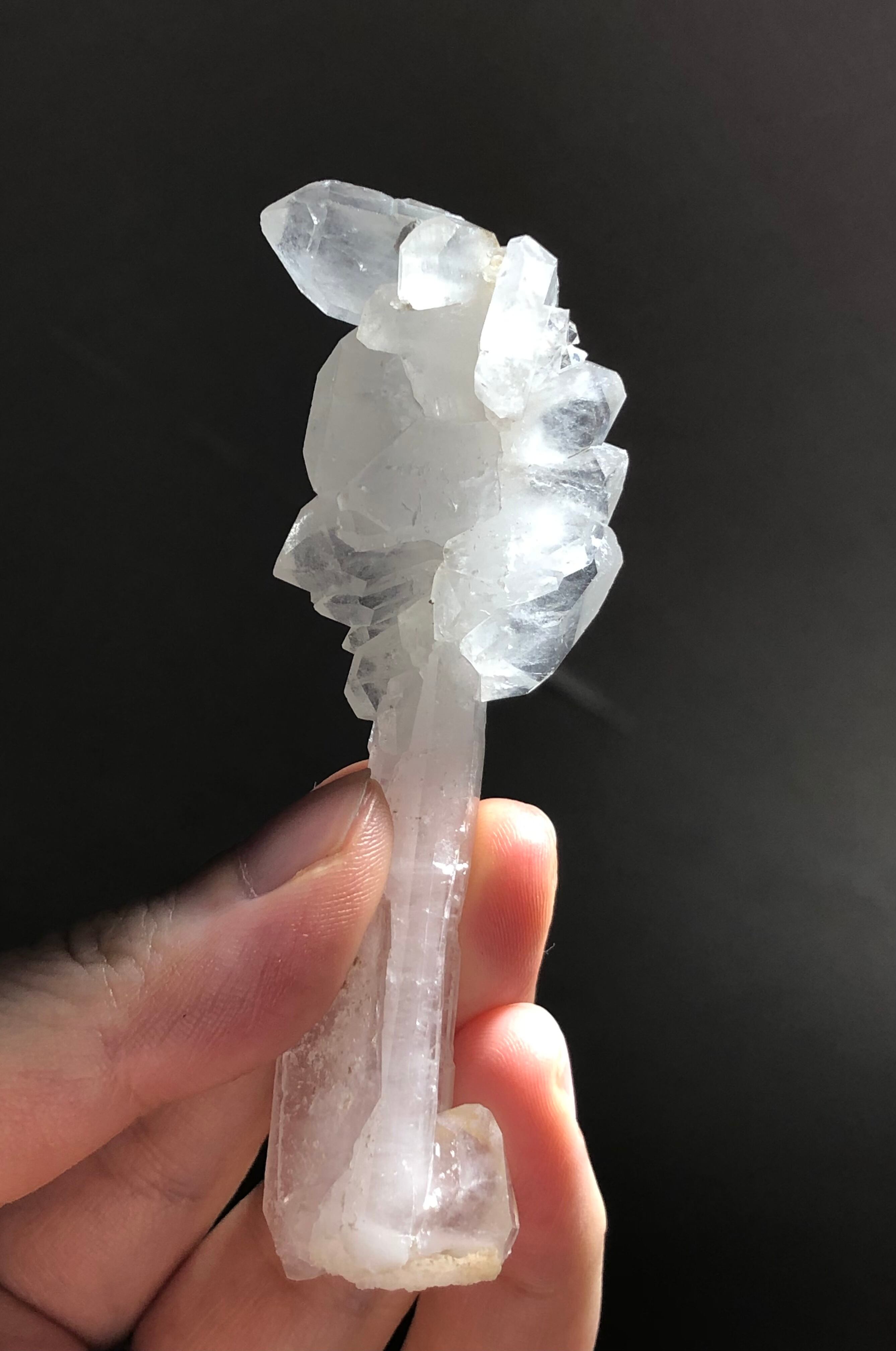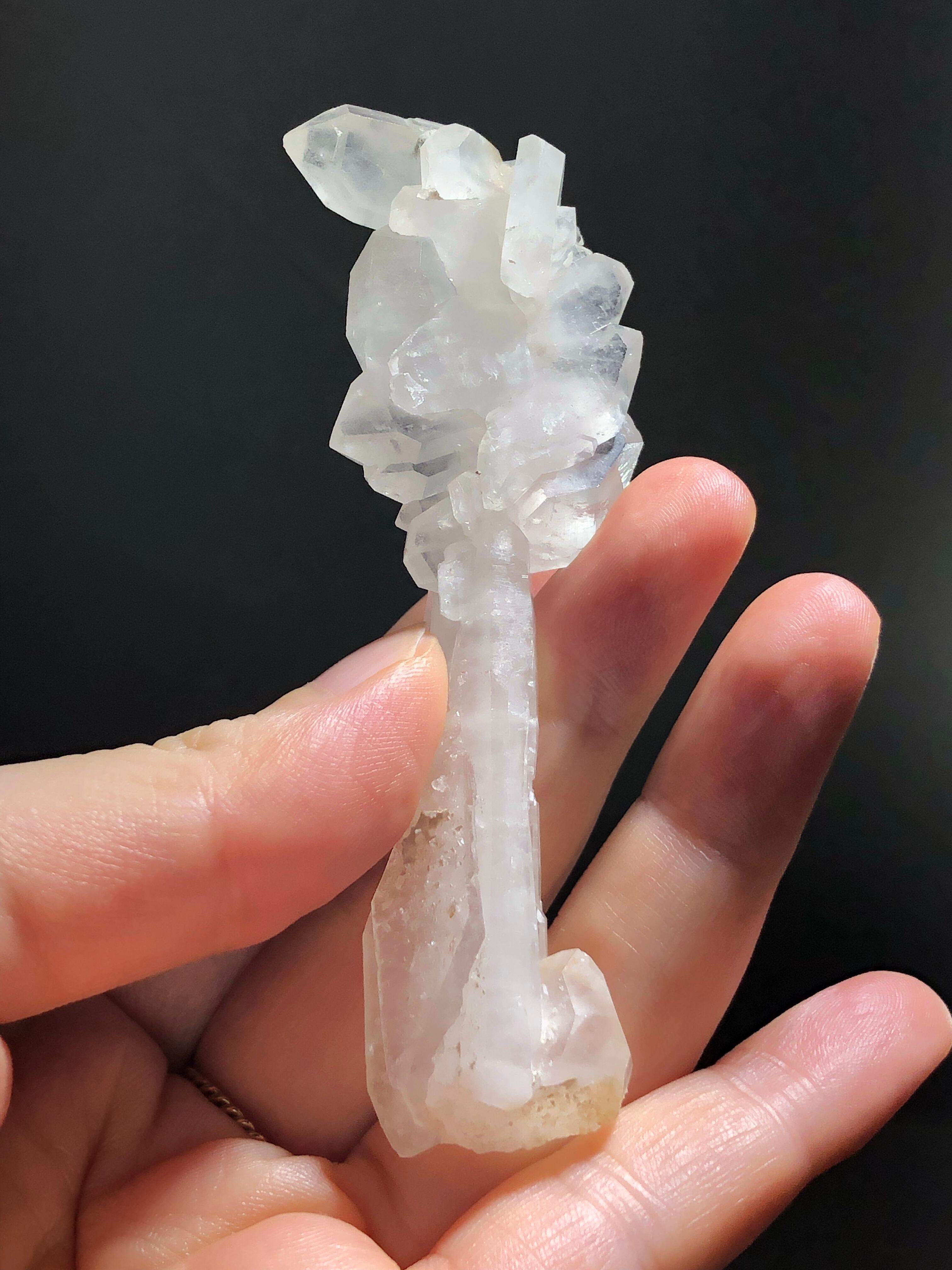 ファーデンクォーツらしいタビュラー型の結晶や、白い糸のようなもやのようなものがみられるのですが、何より全体の、まるで小さな魔法の杖のような形状が美しいです。