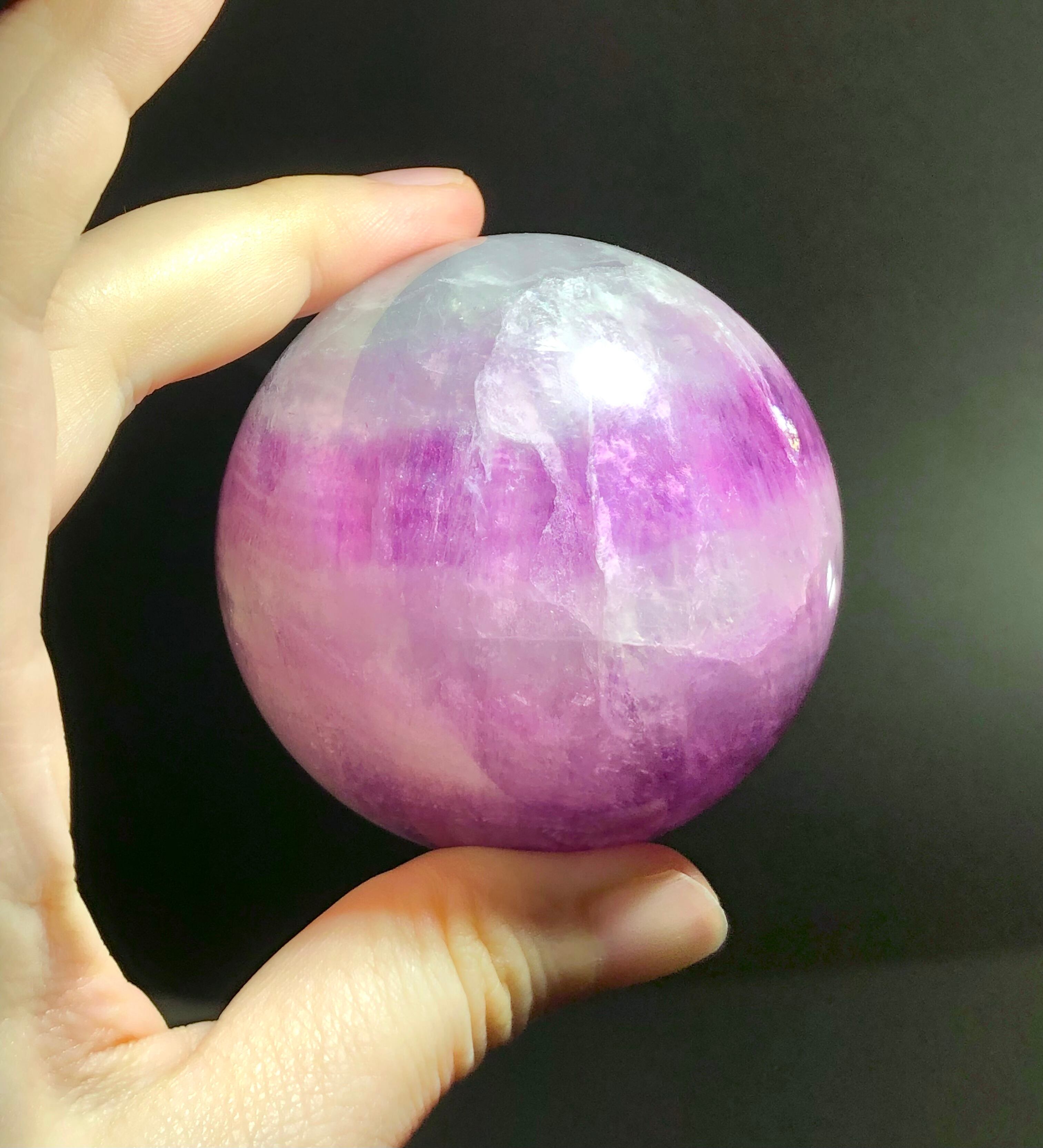 フローライトあるあるなのですが、フローライトは室内の明かりや、屋外で普通に手に乗せて(持って)見るよりも、強い光にかざして見たほうが、そのフローライト本来の素晴らしさがわかります。