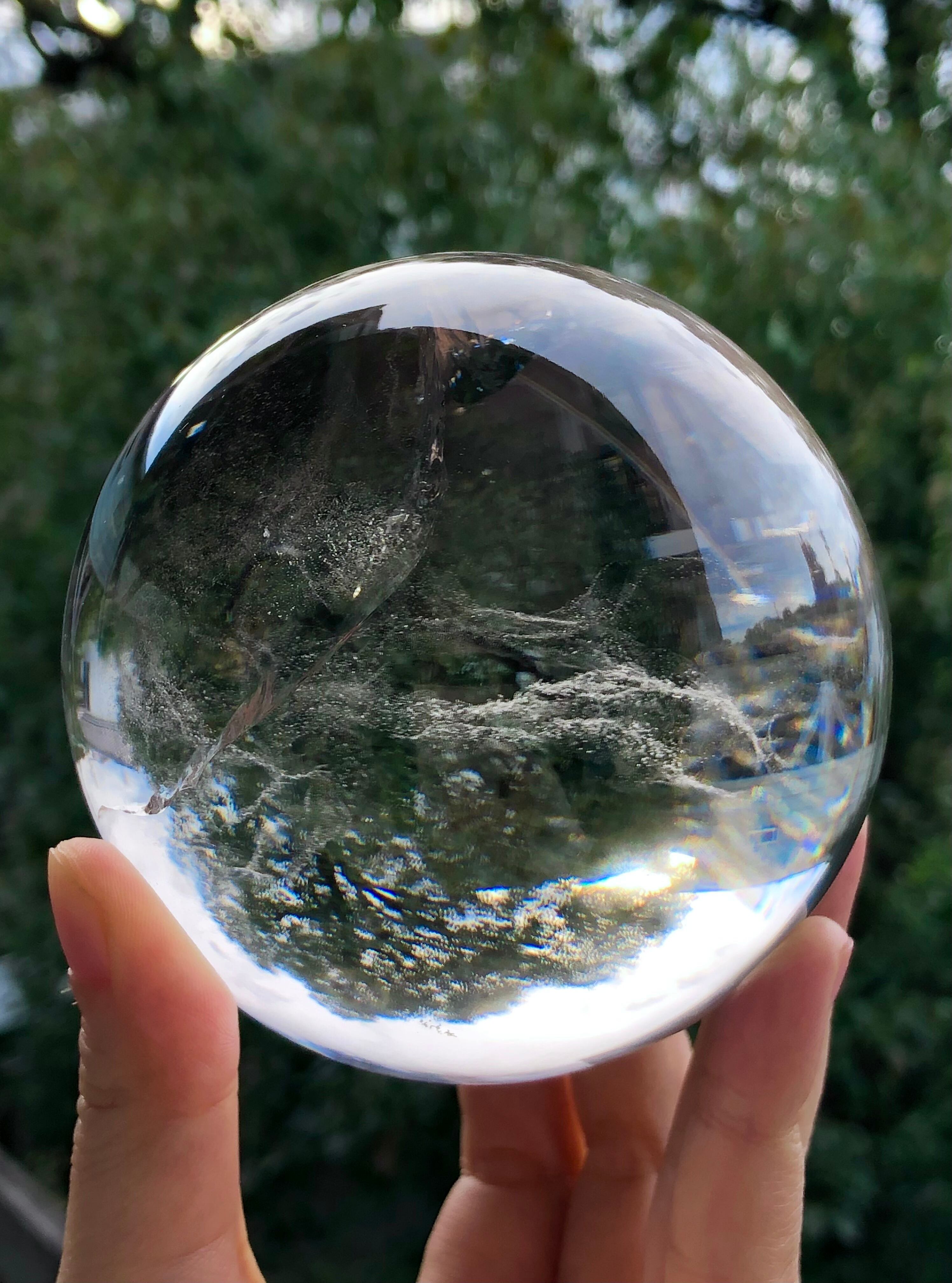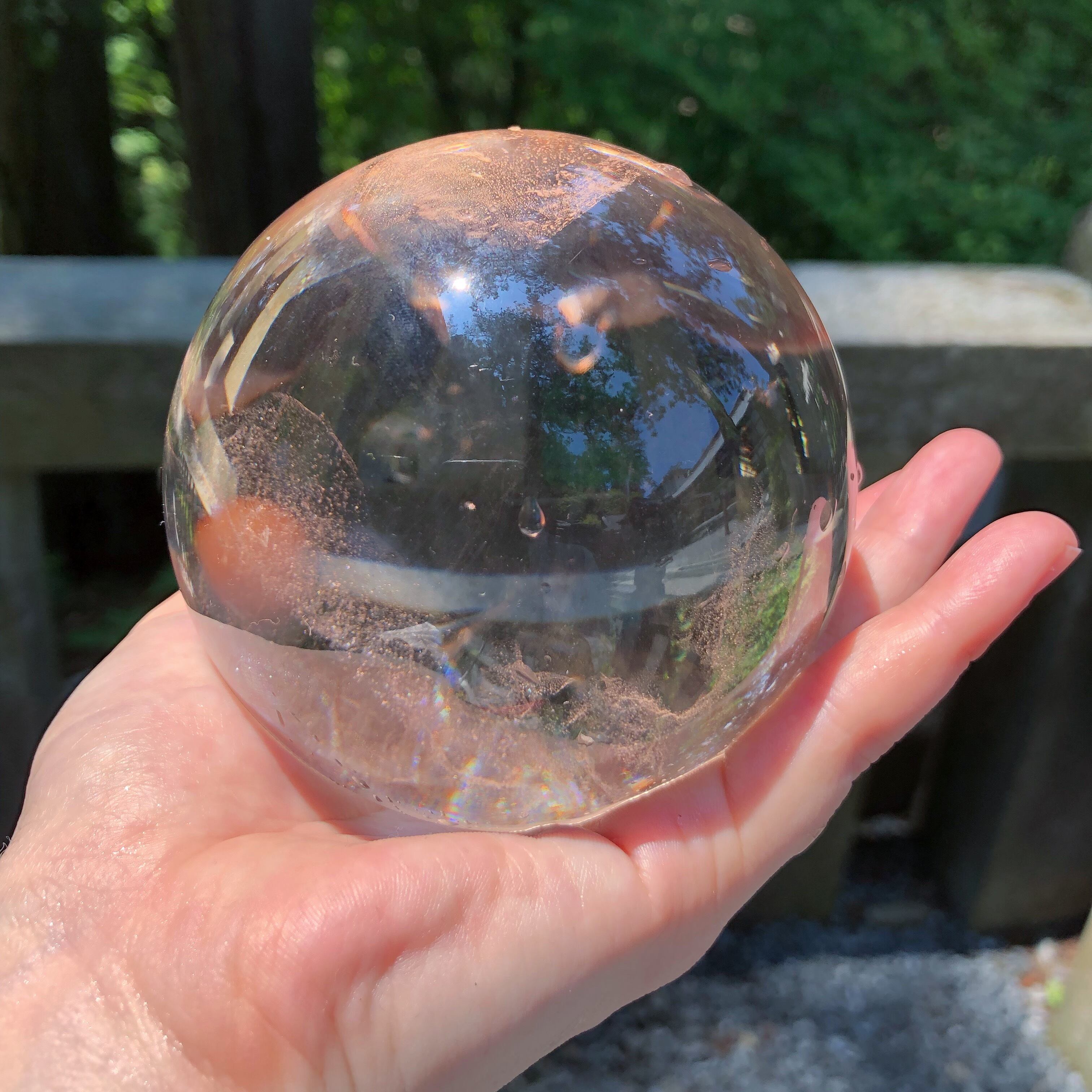 私の手元に来た時には本当に静かな高い周波数の水晶でしたが、全国数カ所の神社へ連れて行き、新潟の龍神にまつわるとある場所へ行った際に、もともとあった小さなクラックが大きくなり、それと同時に虹が入り、パワフルさも加わったように思います。しかもそのクラックが、龍神のようにも感じられるのです。