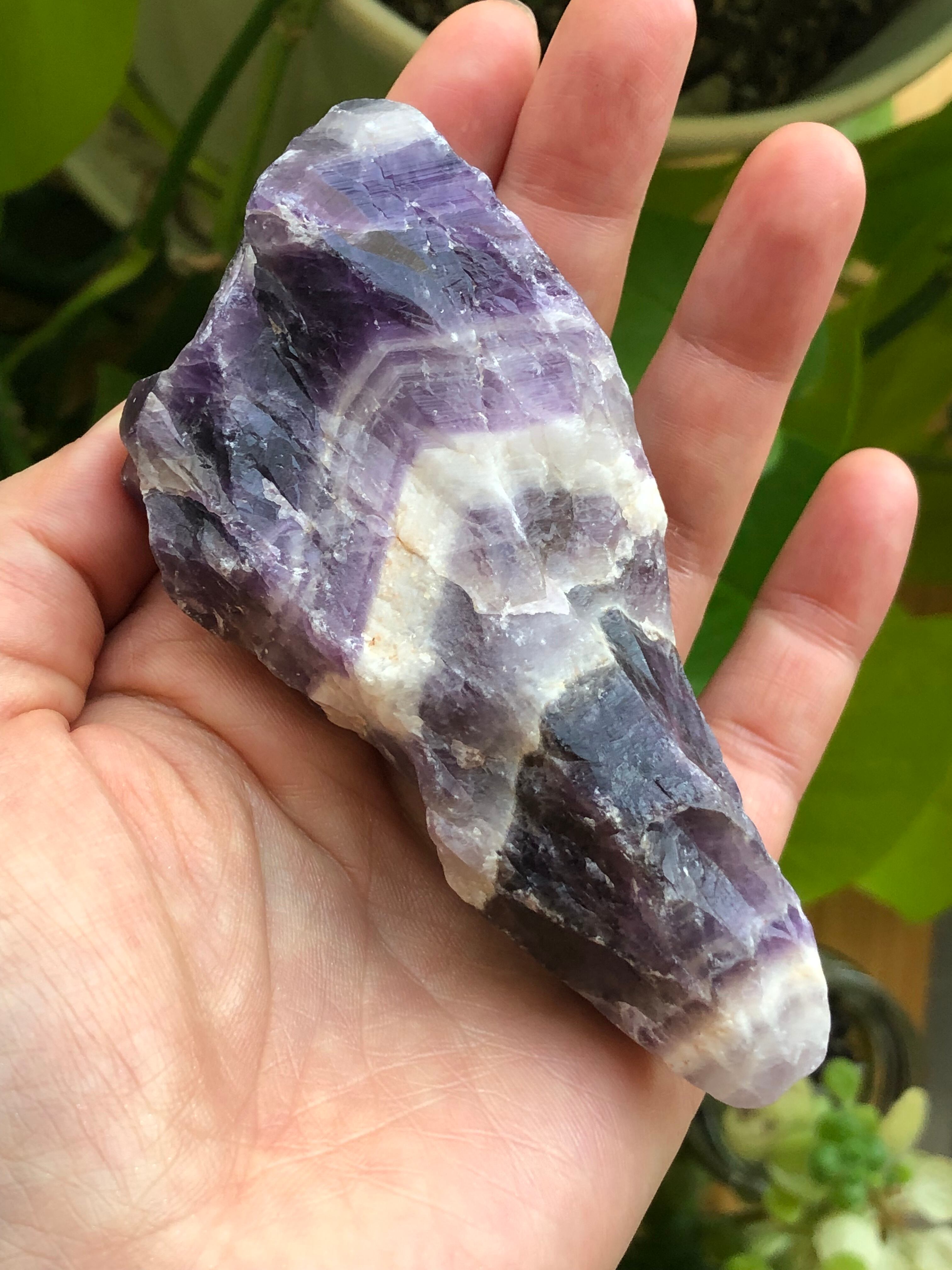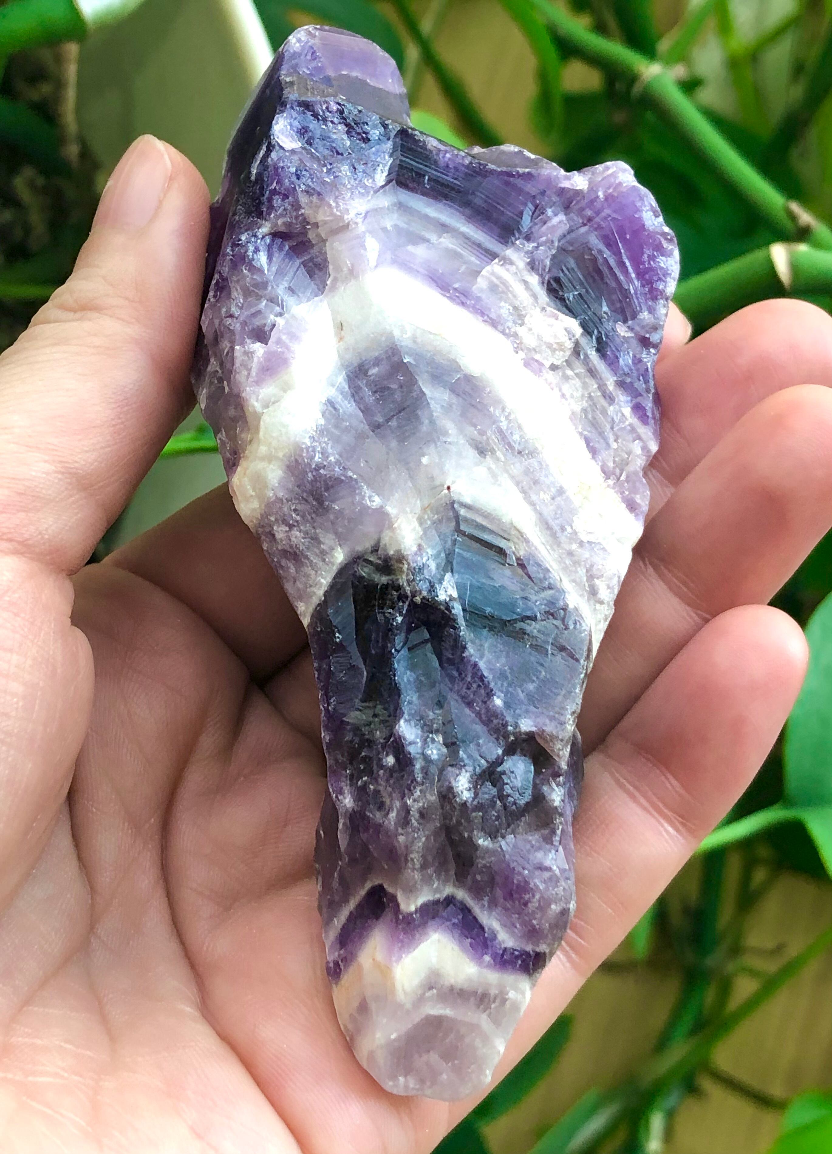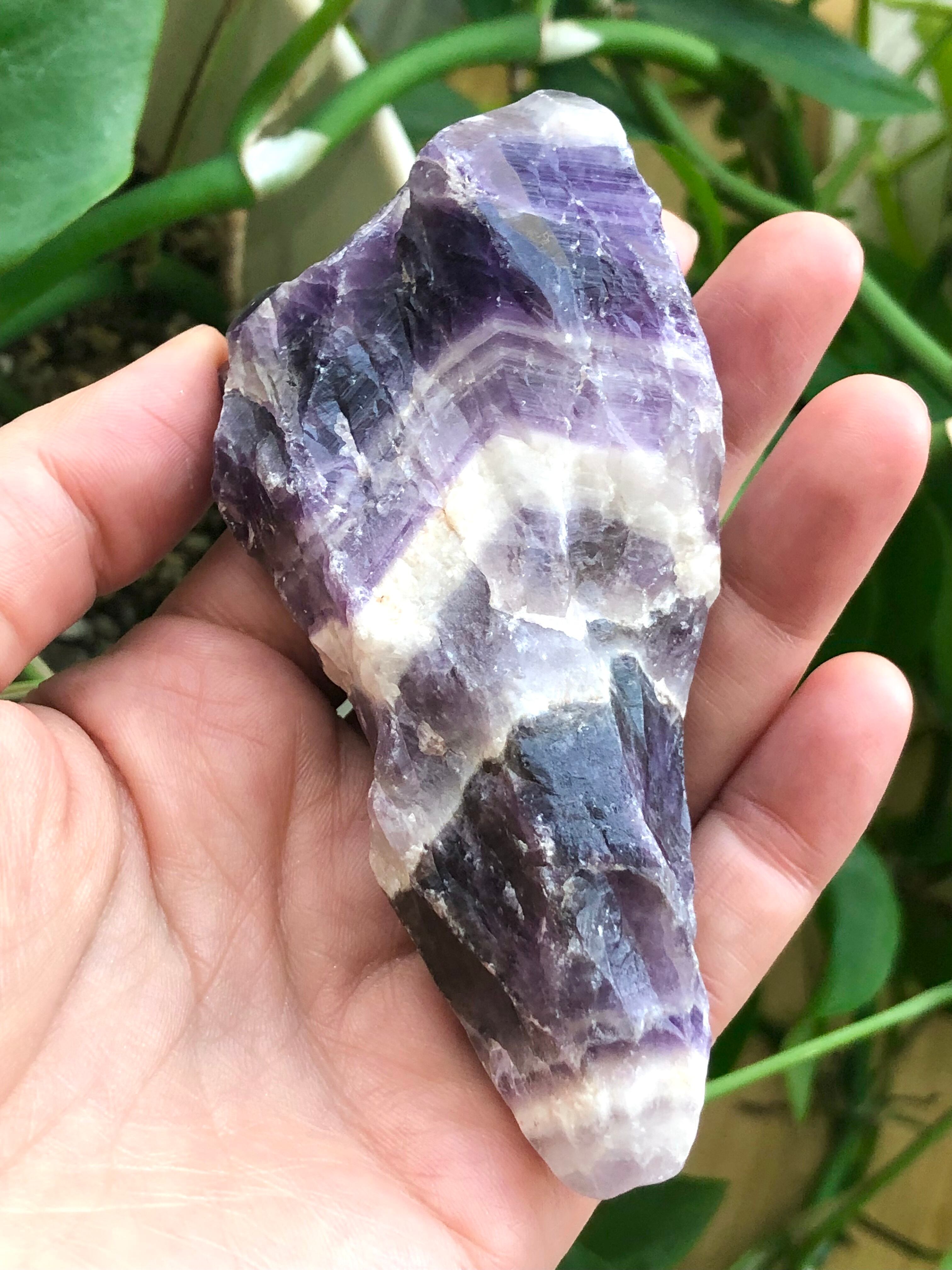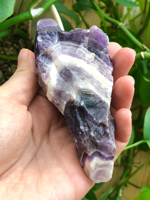 近年発見されてヒーリングストーンとして人気のオーラライトの原石とも似ているのですが(オーラライトにはアメシストが含まれています)、オーラライトのある意味でのシリアスさや重さ、複雑さのような要素はほとんどないところが、このシェブロンアメシスト原石の親しみやすさだと感じます。