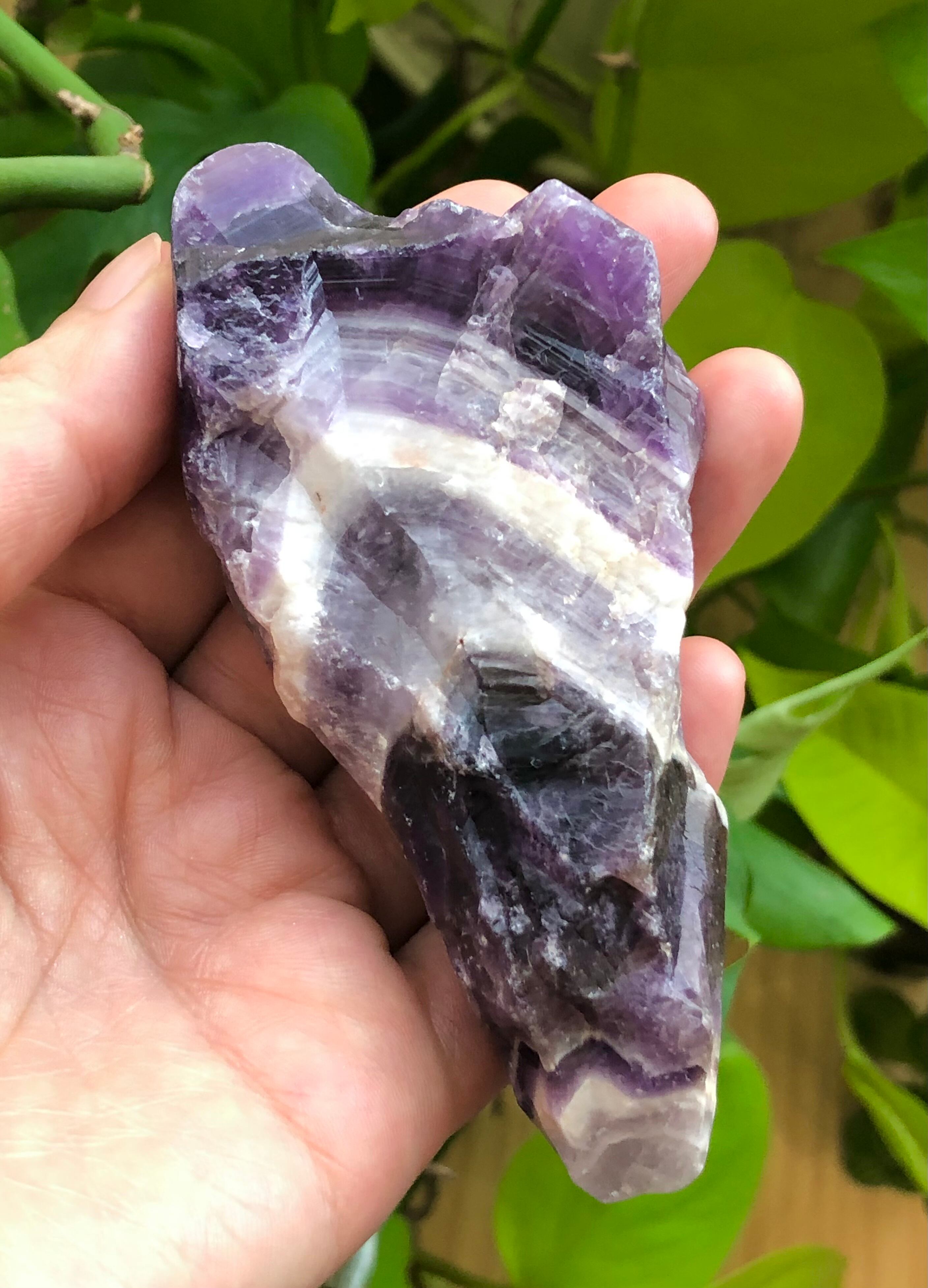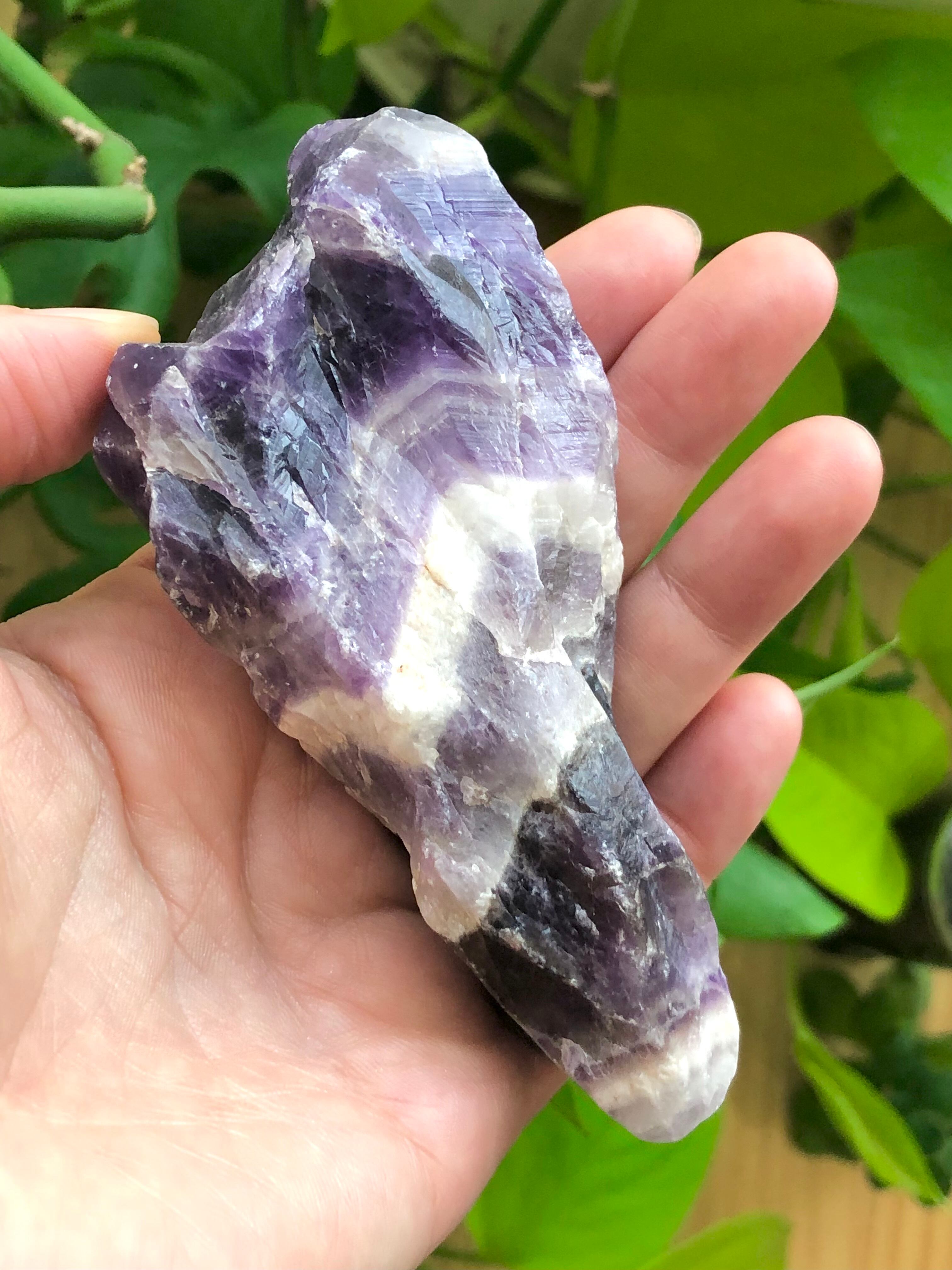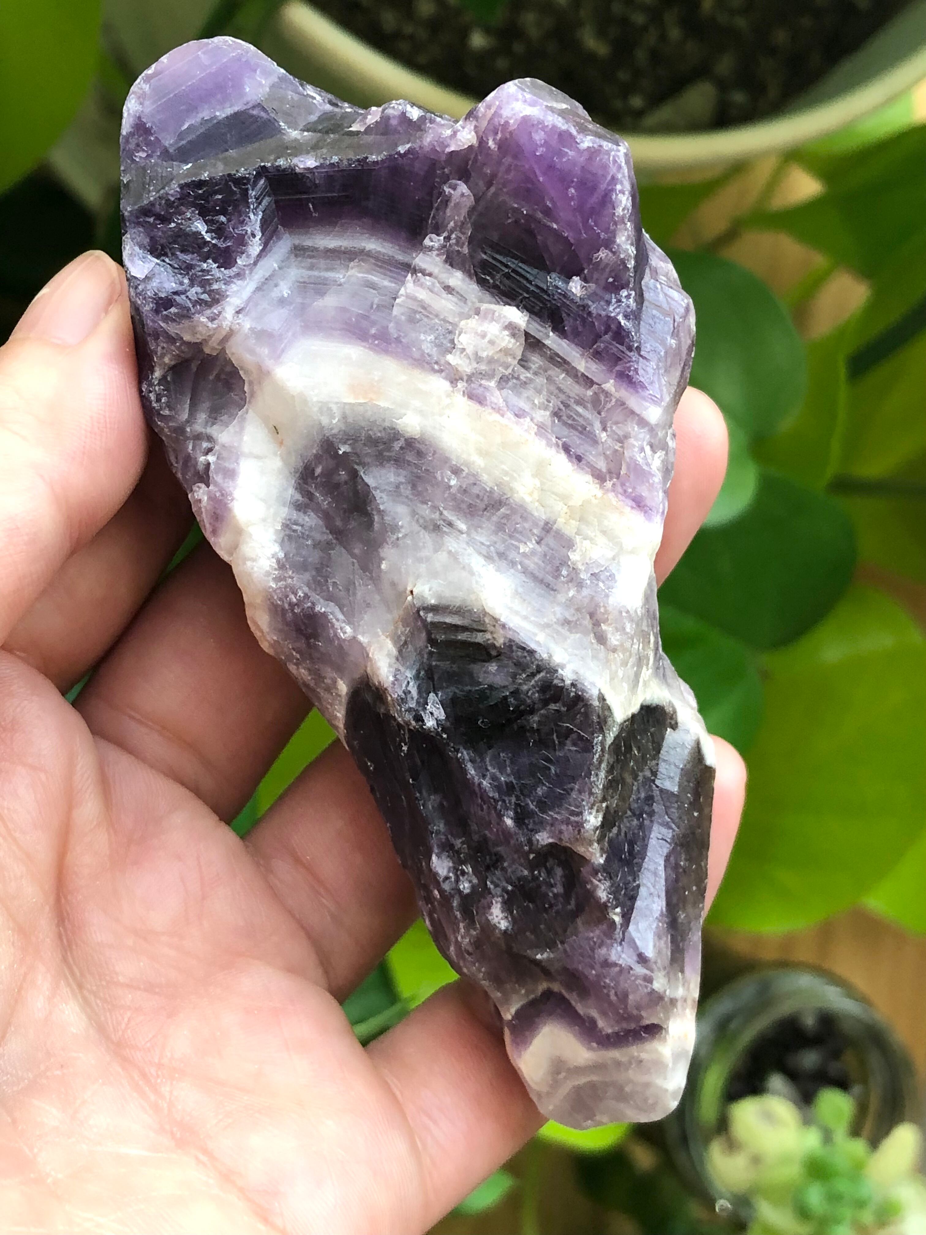 近年発見されてヒーリングストーンとして人気のオーラライトの原石とも似ているのですが(オーラライトにはアメシストが含まれています)、オーラライトのある意味でのシリアスさや重さ、複雑さのような要素はほとんどないところが、このシェブロンアメシスト原石の親しみやすさだと感じます。