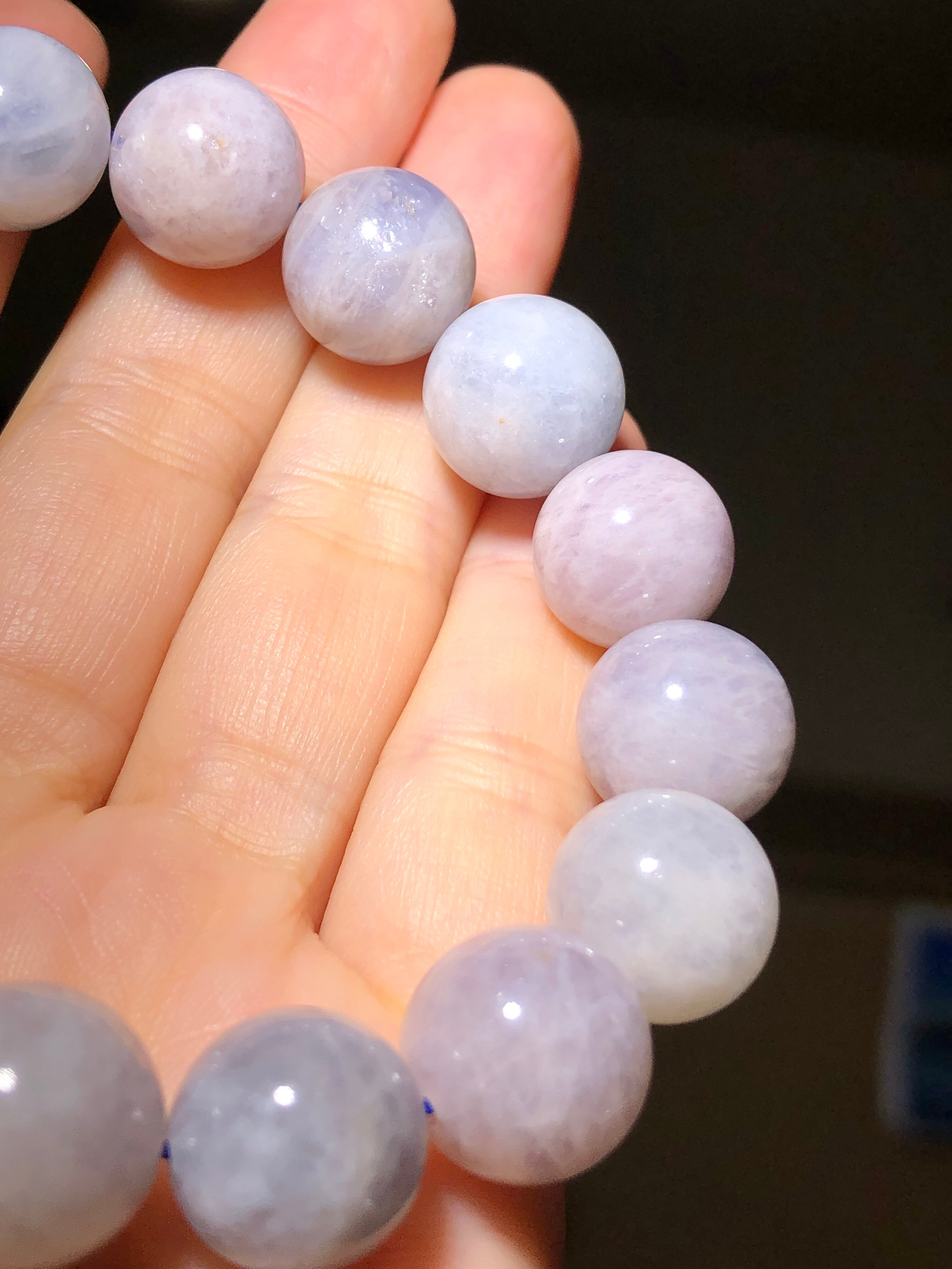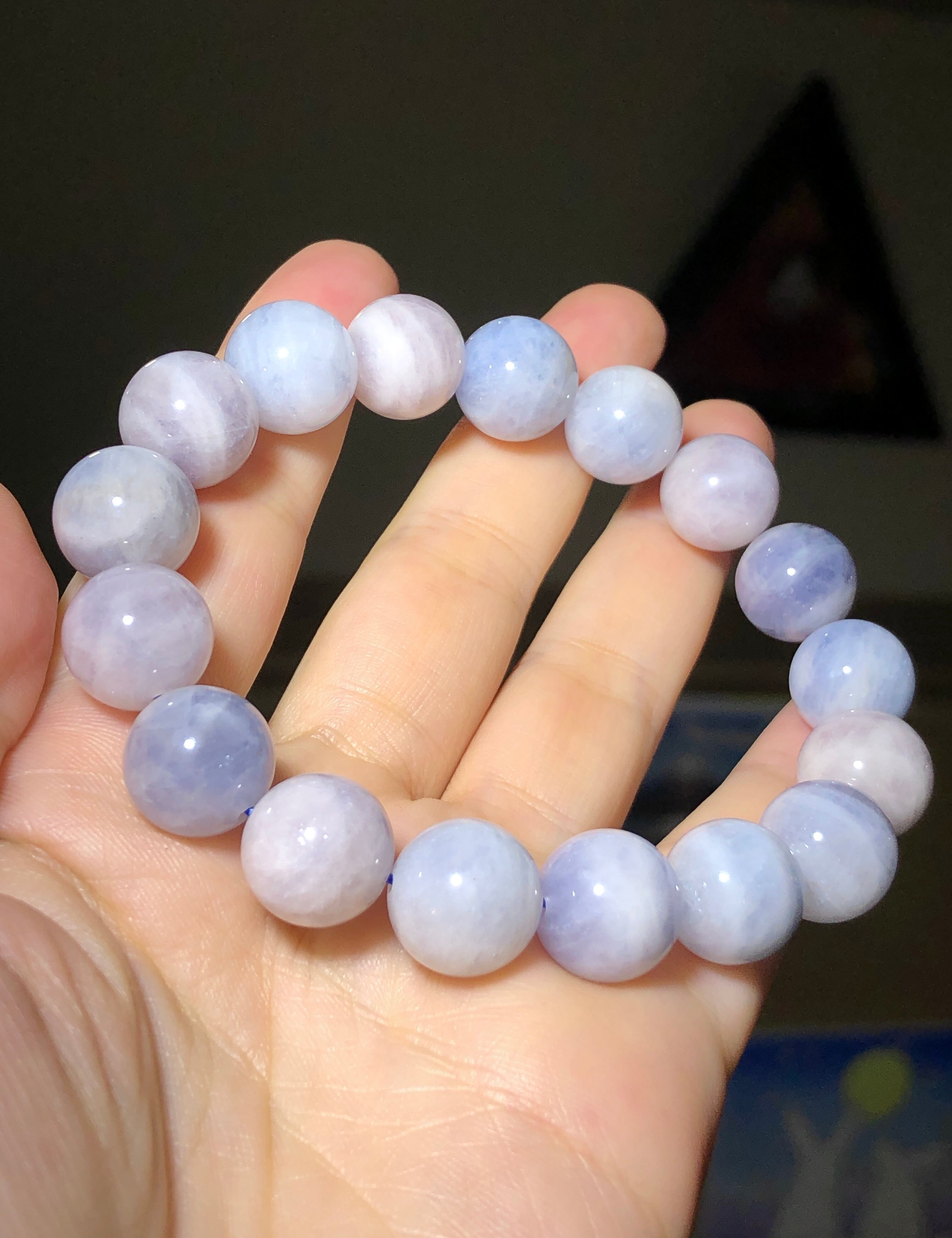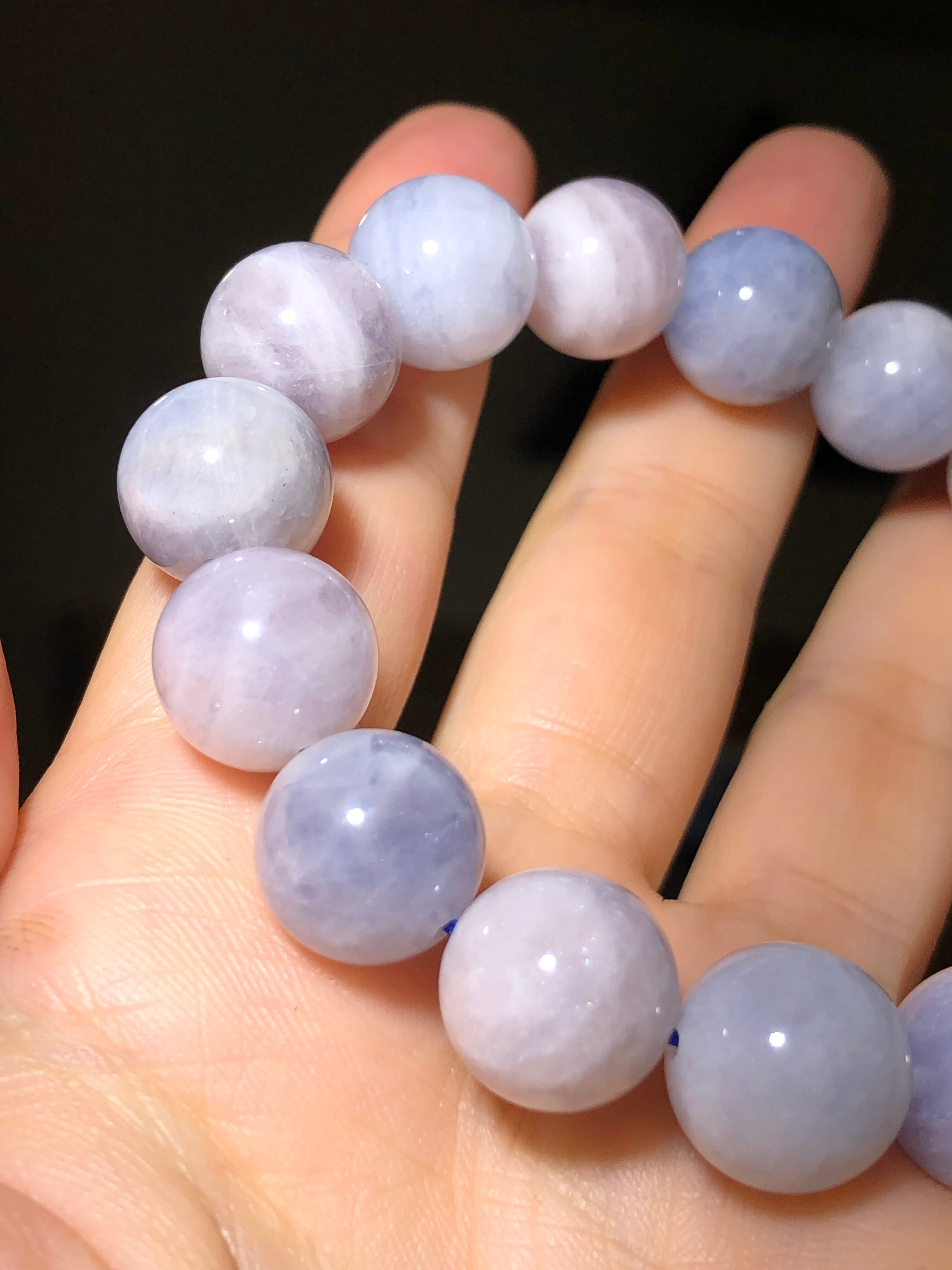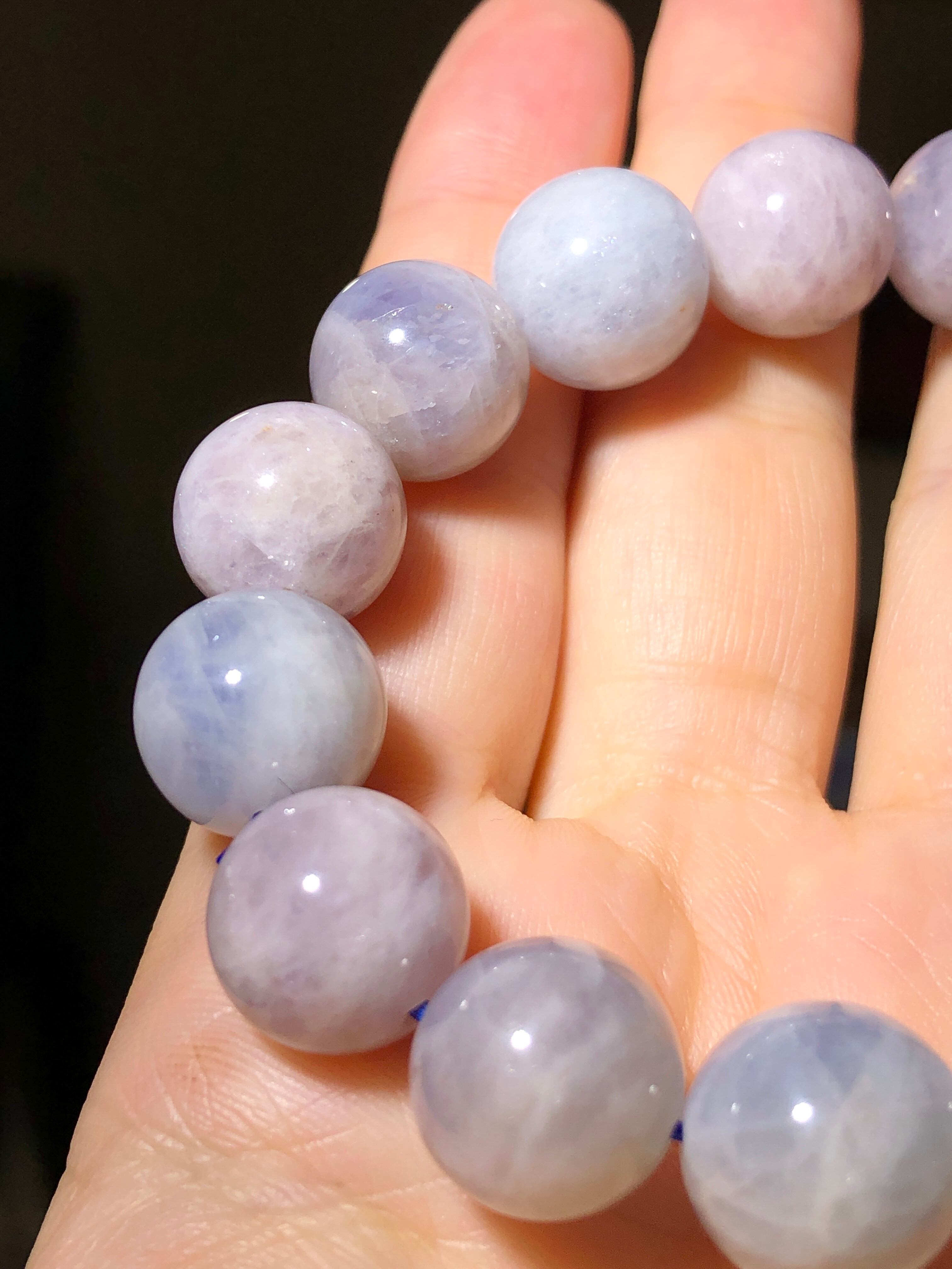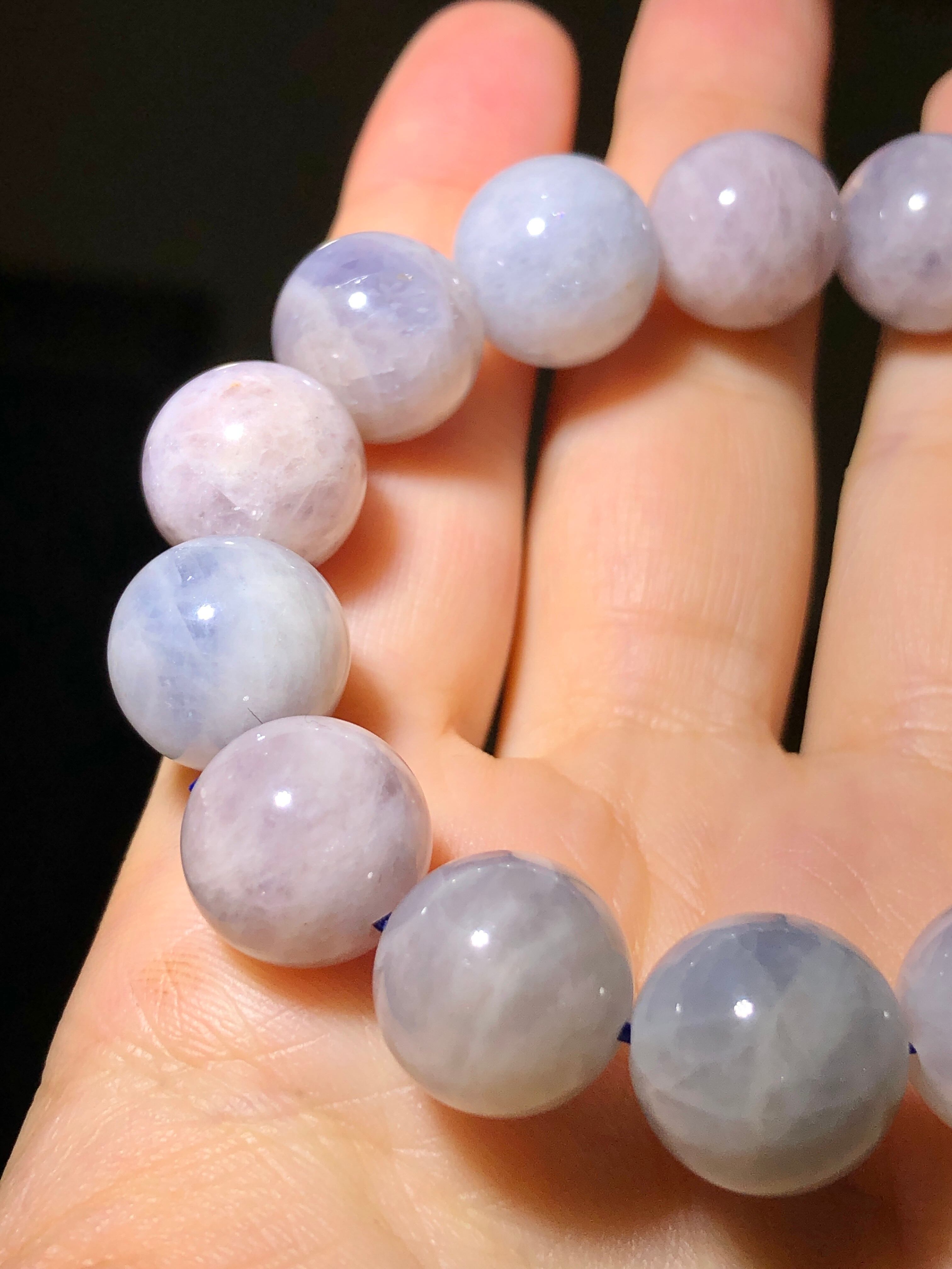 こちらはマダガスカル産ブルーローズクォーツ12ミリ玉ブレス。