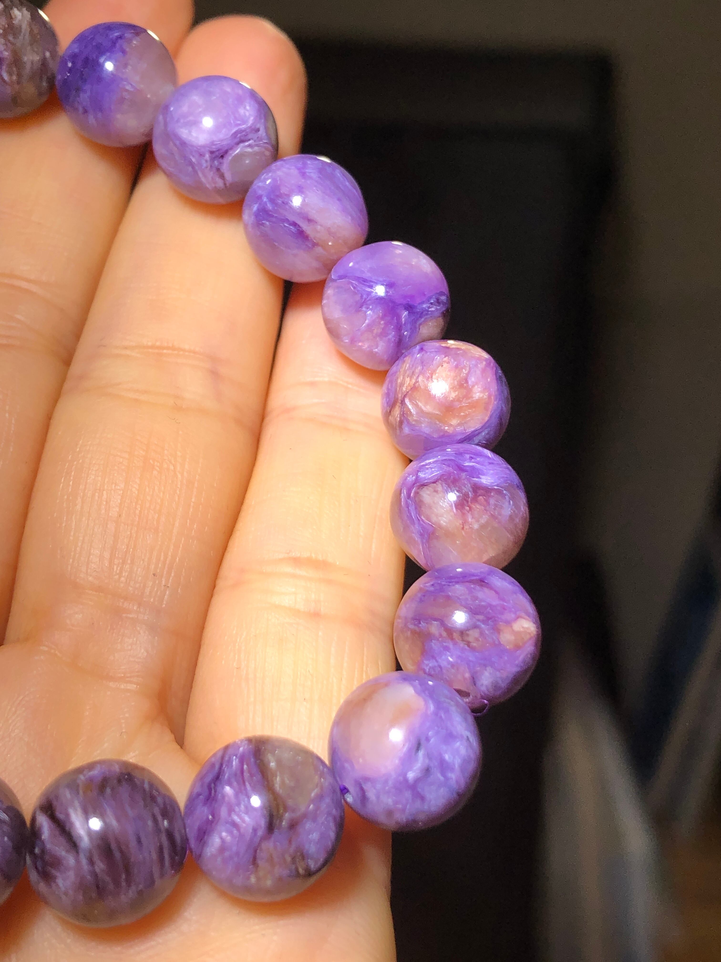 こちらはチャロアイトシリカ10ミリ玉ブレス。