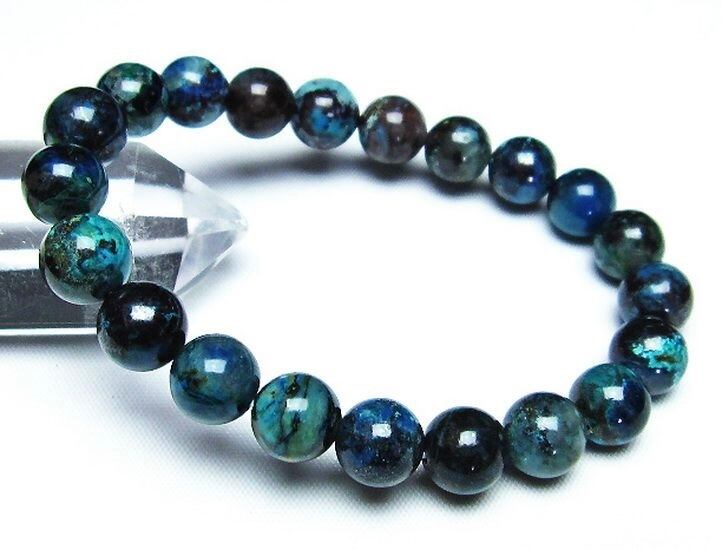 こちらは、クリソコラにアズライトやマラカイトなどが混ざった、いわゆるフェニックスストーンとも呼ばれる石の10ミリ玉ブレス。